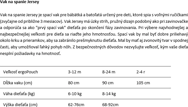 Spací vak ERGOPOUCH Jersey je perfektný „prvý spací vak“ po období zavinovania. Prináša bábätku pocit istoty vďaka úzkemu, pružnému strihu, zároveň však ponecháva voľnosť nožičkám v zvonovej spodnej časti schválenej Medzinárodným inštitútom pre dyspláziu bedier. Hodnota 0,2 TOG zaisťuje ľahké prikrytie do teplejších nocí a podporuje bezpečné spanie bez voľných prikrývok v postieľke.