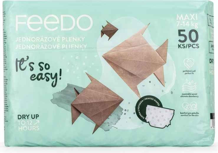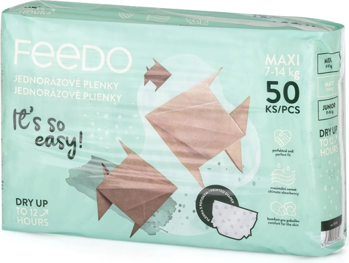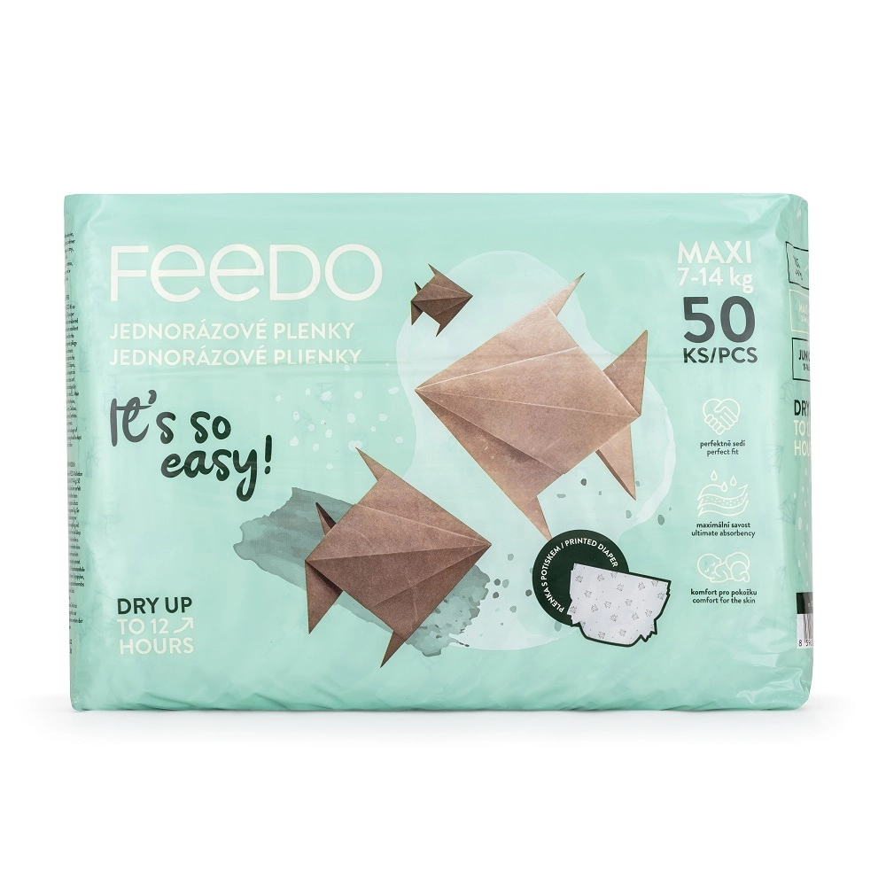 FEEDO jednorazové plienky Maxi kombinujú vysokú savost, priedušnosť a bezpečné zloženie bez parfumov a latexu. Trojvrstvové jadro rýchlo odvádza vlhkosť a udržiava pokožku v suchu, zatiaľ čo elastické manžetky okolo nožičiek a pružný pás zabezpečujú isté, ale pohodlné usadenie bez obmedzenia pohybu.