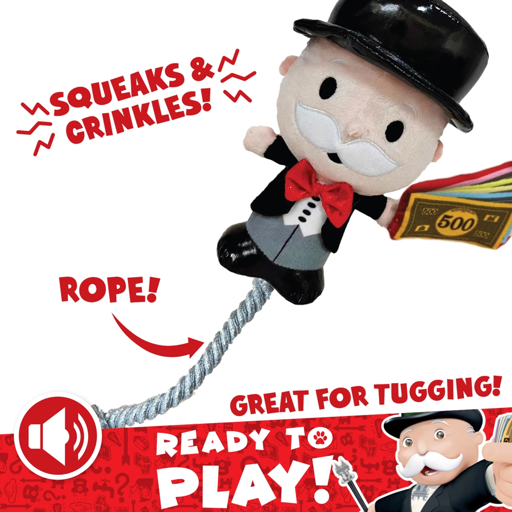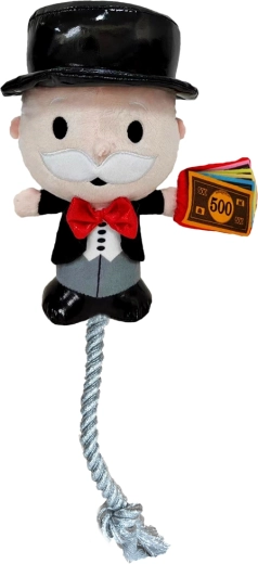 Táto oficiálne licencovaná plyšová hračka s ikonickou postavičkou z hry MONOPOLY spája mäkký dotyk a odolné prevedenie. Je ideálna na preťahovanie, aportovanie aj samostatné hranie. Vďaka kombinácii plyšu a pleteného lana zvláda jemnú až strednú intenzitu zaťaženia a zároveň je príjemná na hryzenie.