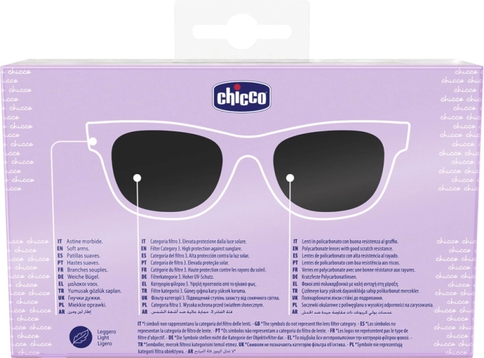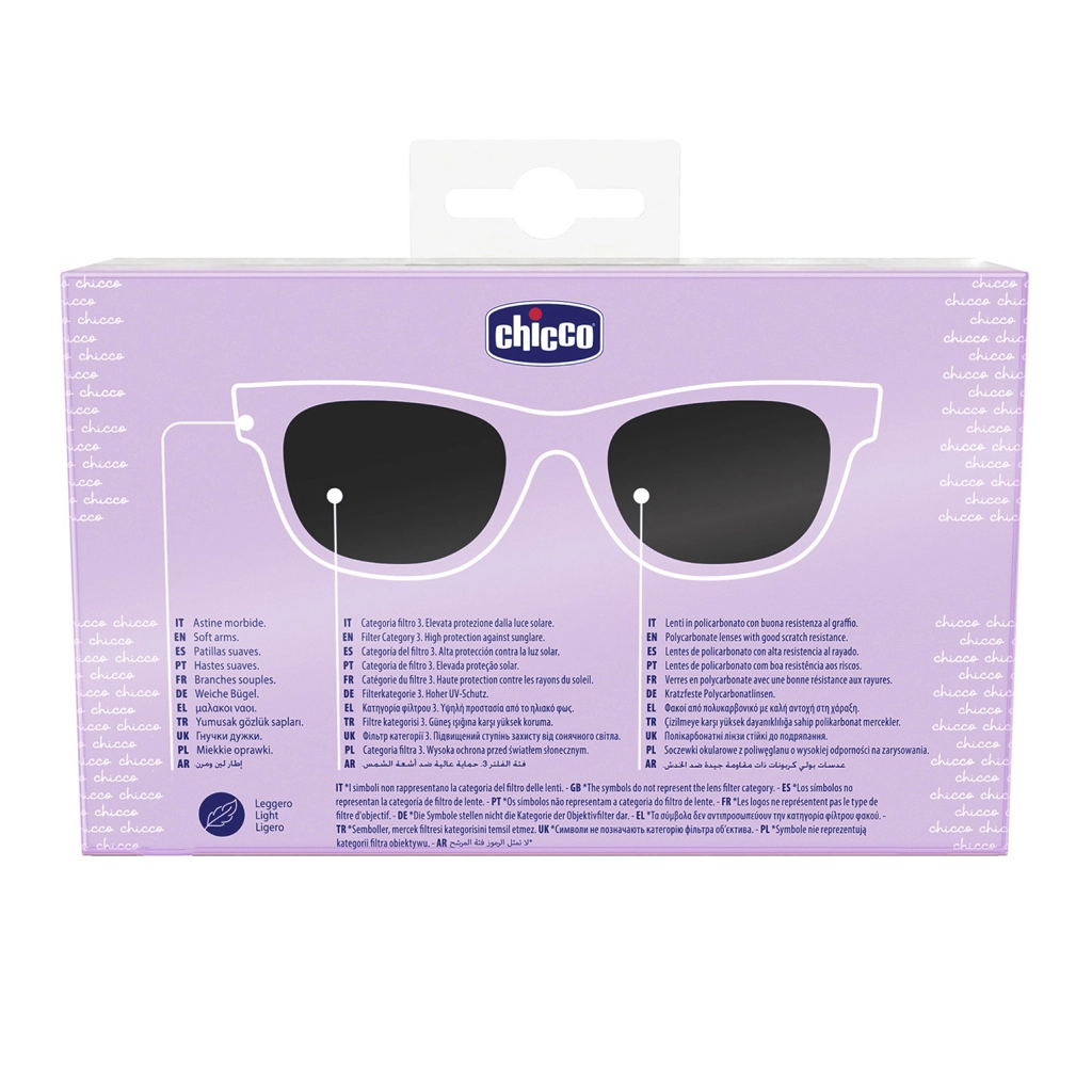 Štýlové detské slnečné okuliare CHICCO poskytujú 100 % UVA/UVB ochranu a majú tmavý filter kategórie 3. Vďaka flexibilným, hypoalergénnym a netoxickým rámom sú pohodlné a bezpečné na každodenné nosenie. Odolný polykarbonát chráni proti nárazom a poškrabaniu, súčasťou je aj praktické látkové puzdro.