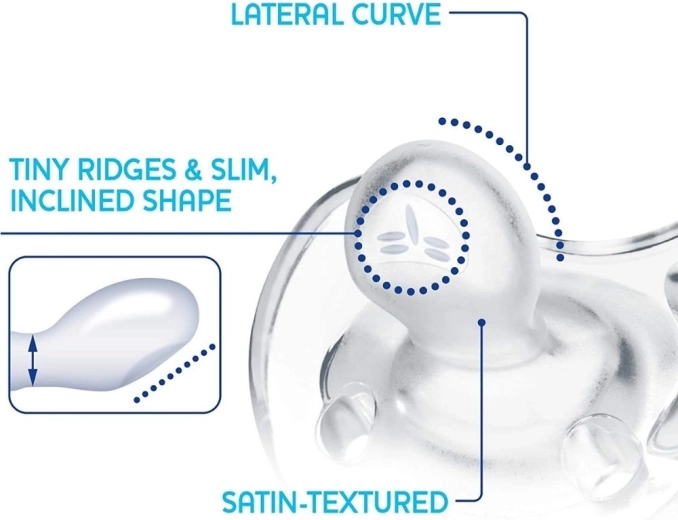 Vďaka zúženej a pružnej krčnej časti sacieho nástavca dieťa ľahko zavrie ústa a znižuje sa riziko nerovnomerných zubných oblúkov. Celosilikónová konštrukcia je ideálna aj na spánok a pohodlná na každodenné používanie. Praktické zadné držadlo umožňuje jemné pridržiavanie alebo pripnutie na univerzálny klip.
