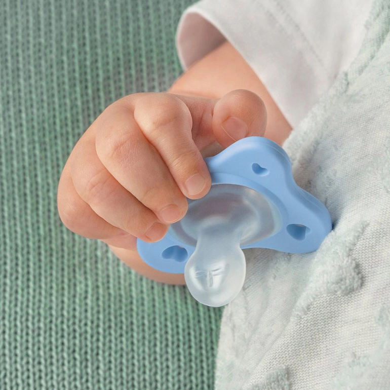 Extra jemný, 100 % silikón s pružným jadrom šetrne kopíruje ústnu dutinu a upokojuje bábätko bez podráždenia.