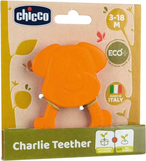 Hryzadlo Chicco Eco+ v tvare roztomilého psíka Charlie je navrhnuté pre detské potreby od 3 mesiacov. Mäkký, poddajný materiál a premyslené hrbolčeky poskytujú príjemnú masáž ďasien a pomáhajú zmierniť nepohodlie pri raste zúbkov. Ergonomický tvar sa ľahko drží aj tými najmenšími ručičkami.