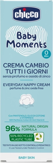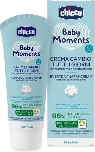 Jemný krém na každý deň na starostlivosť o detský zadoček od značky Chicco s podielom 96 % prírodných zložiek. Má ľahkú neparfumovanú textúru, ktorá sa ľahko rozotiera a je vhodná pre citlivú pokožku od narodenia (0m+). Obsahuje bavlníkový olej, panthenol a vitamín E na upokojenie a hydratáciu pokožky pri každodennom používaní.