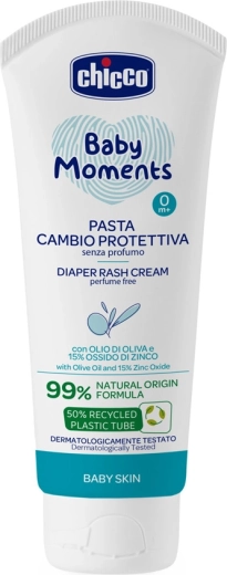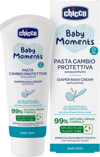 Chráňte jemnú pokožku bábätka pri každej výmene plienky. CHICCO Baby Moments krém na detský zadoček so zinkom obsahuje 15 % oxidu zinočnatého, ktorý vytvára ochranný, priedušný film a pomáha predchádzať vzniku zaparenín. Ľahké, nelepivé zloženie sa ľahko rozotiera a rýchlo sa vstrebáva bez zanechávania bielych stôp.