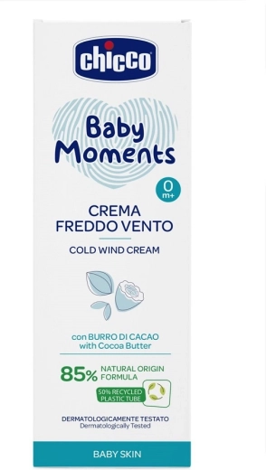 Jemný ochranný krém CHICCO Baby Moments chráni citlivú detskú pokožku pred chladom a vetrom. Jeho receptúra s 81 % prírodných zložiek, kakaovým a bambuckým maslom, panthenolom a omega-3 olejmi posilňuje kožnú bariéru a zanecháva pleť hebkú a vyživenú. Bez parabénov, farbív a alkoholu, s jemnou vôňou Baby Moments. Dermatologicky aj oftalmologicky testované, vhodné od narodenia.