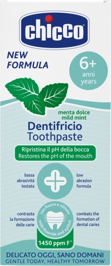 Zubná pasta Chicco Jemná mäta poskytuje šetrnú a účinnú starostlivosť o detský chrup po prerezaní trvalých zubov. Neabrazívne zloženie rešpektuje citlivú zubnú sklovinu a minimalizuje riziko jej poškodenia. Kombinácia betainu a vitamínu E pomáha chrániť a upokojovať ďasná, zatiaľ čo fluór podporuje odolnosť skloviny proti zubnému kazu.