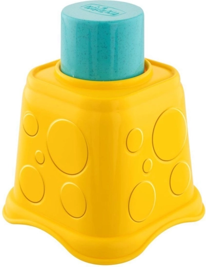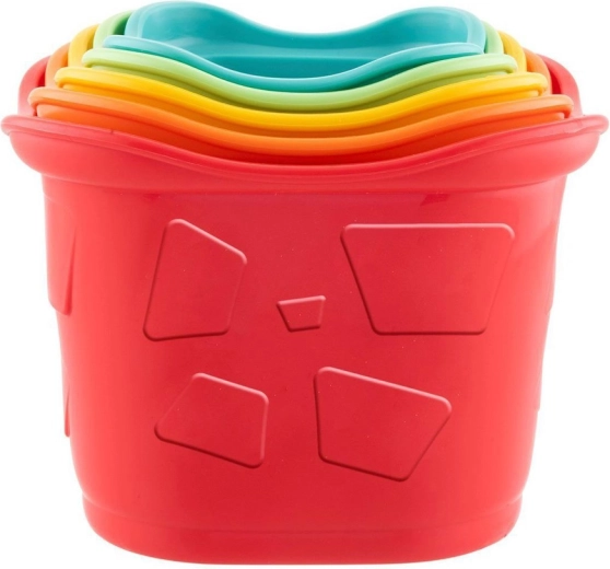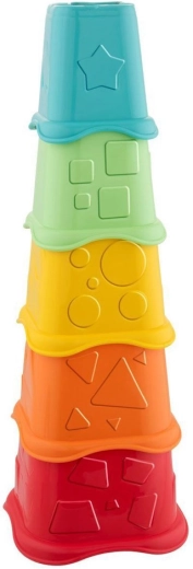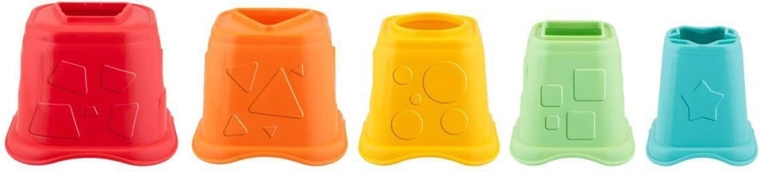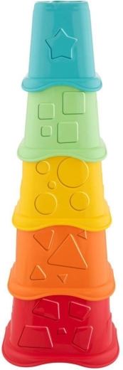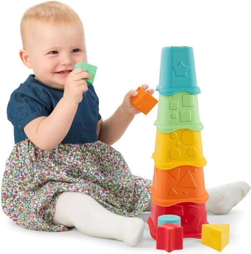 Deti stavajú vežu z pohárikov, vkladajú kelímky do seba a triedia 5 tvarov cez zodpovedajúce otvory – ideálne pre jemnú motoriku a logiku.