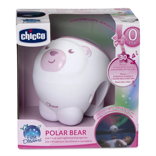 Chicco projektor polárnej žiary v rozkošnom dizajne medvedíka vytvára príjemnú atmosféru pre večerné upokojenie a spánok. Farebná, dynamická projekcia pripomínajúca polárnu žiaru premení detskú izbu na kúzelné miesto, zatiaľ čo vybrané melódie Mozart, Bach, Glinka a upokojujúce zvuky prírody pomôžu bábätku ľahšie zaspať.