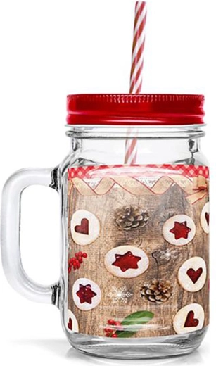 Užite si obľúbené limonády, ľadové čaje alebo miešané drinky štýlovo. Štvorhranný pohár s uchom a kovovým skrutkovacím viečkom udrží nápoj v bezpečí a vďaka tesneniu minimalizuje riziko vyliatia. Priehľadné sklo zdobí hravá potlač lineckého pečiva, ktorá navodí sviatočnú atmosféru a zaujme na každom stole.