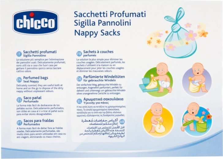 Už žiadne nepríjemné pachy pri vyhadzovaní použitých plienok. Parfumované vrecká CHICCO predstavujú jednoduchý spôsob, ako rýchlo a hygienicky zlikvidovať plienky bez šírenia zápachu v byte či aute. Stačí vložiť plienku, uzavrieť a vyhodiť do bežného odpadu.