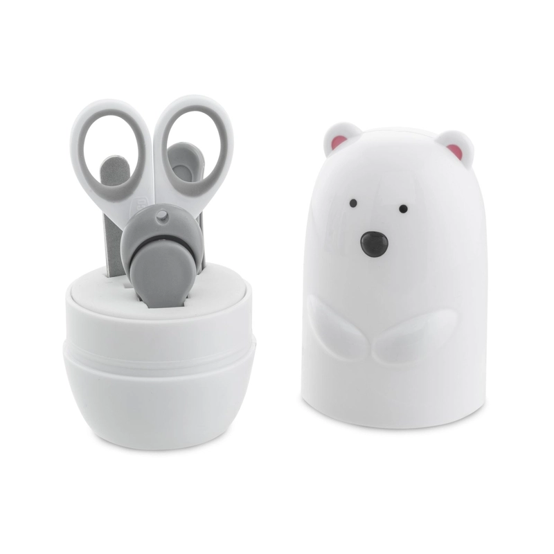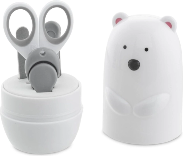 Praktická sada na starostlivosť o detské nechty 4v1 v rozkošnom puzdre v tvare polárneho medveďa. Obsahuje všetko potrebné na bezpečné a jemné skracovanie a úpravu nechtov od narodenia – nožničky z nehrdzavejúcej ocele, 2 pilníky, zastrihávač s protišmykom a pinzetu. Ideálne do výbavičky pre bábätko aj na cesty.