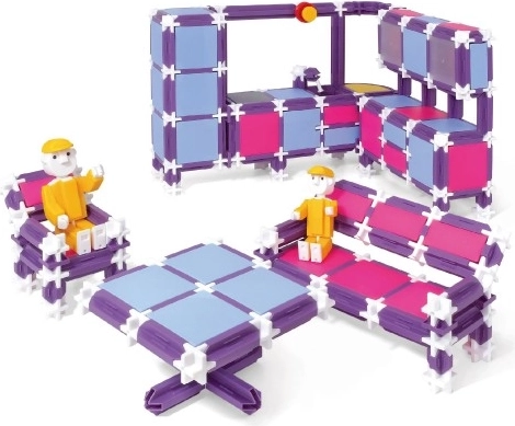 Stavebnica SEVA RODINA – Bývanie prináša pestré možnosti pre malé staviteľky a staviteľov. Vďaka kombinácii fialovej, ružovej a svetlomodrej farby vznikajú originálne modely, ktoré potešia každé dieťa. Poskladajte si pohodlné „letisko“ – širokú posteľ, modernú rohovú kuchynskú linku s drezom a vstavanou chladničkou, jedálenský kút, pohovku, poličky, skrinky aj šikovné regály.