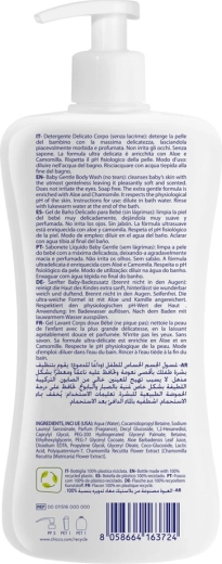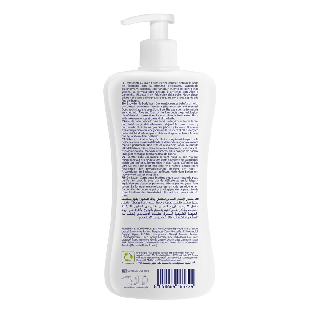 Jemný sprchový gél Chicco Natural Sensation je určený na každodenné umývanie citlivej detskej pokožky už od narodenia. Je dermatologicky a pediatricky testovaný, rešpektuje prirodzené pH a zanecháva pokožku hebkú a príjemne prevoňanú. Obsahuje aloe vera na hydratáciu a upokojenie a harmanček na zjemnenie. Vyrobené v Taliansku, veľké balenie 500 ml na praktické používanie.