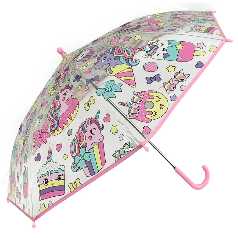 Roztomilý detský priehľadný dáždnik s motívom jednorožcov ochráni pred dažďom a zároveň umožní deťom pohodlne vidieť na cestu. Vďaka ľahkej konštrukcii a jednoduchému ovládaniu je vhodný aj pre malé deti. Priehľadný dizajn, obľúbený motív jednorožcov a jednoduché otváranie z neho robia ideálny doplnok do škôlky aj na cesty.