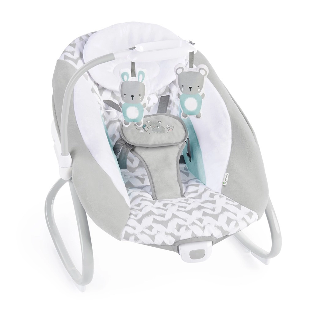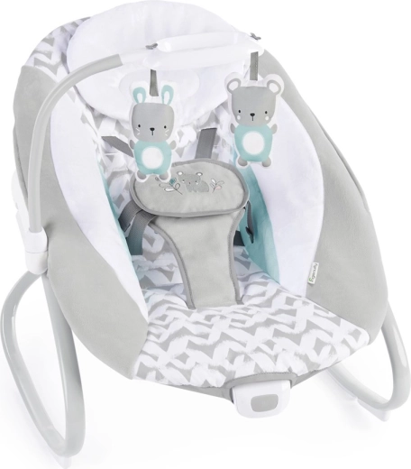 O pohodlie sa stará mäkké, plyšové polstrovanie s vyberateľnou opierkou hlavy, bezpečnosť zaisťuje spoľahlivé pripútanie a zábavu doplní odnímateľná hrazdička s dvoma hračkami. Praktické USB napájanie (kábel 1,83 m v balení) minimalizuje potrebu batérií, sedačkovú vložku aj opierku hlavy možno prať v práčke. Vďaka skladaciemu rámu s kolieskami a rukoväťou sa hojdačka ľahko prenáša a je ideálna do menších priestorov aj na cesty.
