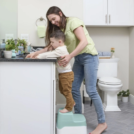 Stabilná dvojstupňová stolička s protišmykovým povrchom pomáha deťom bezpečne dosiahnuť na toaletu aj umývadlo.