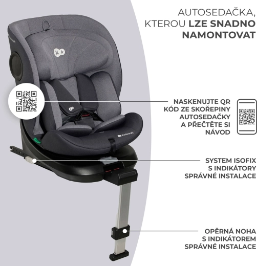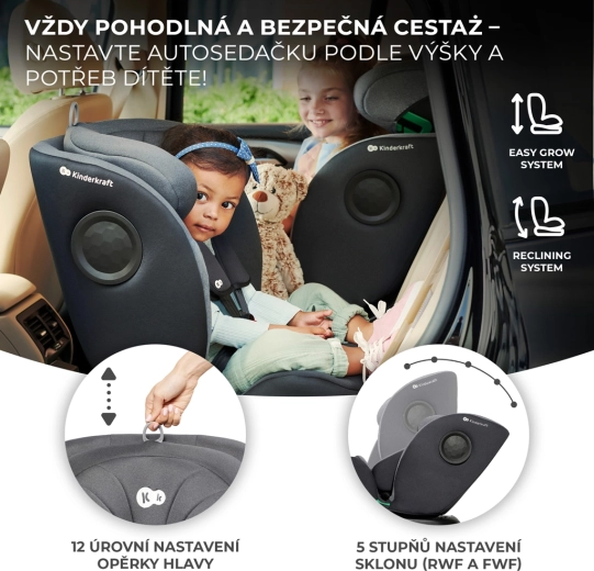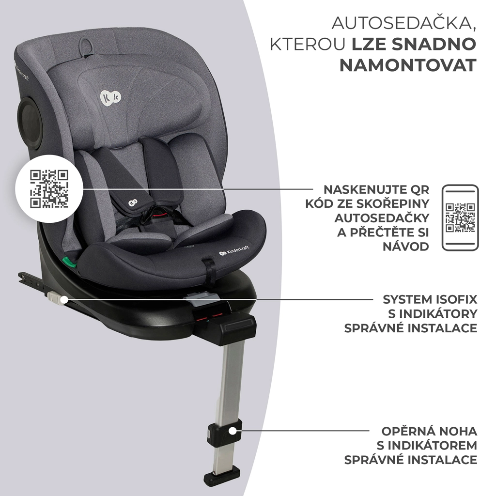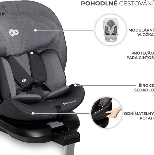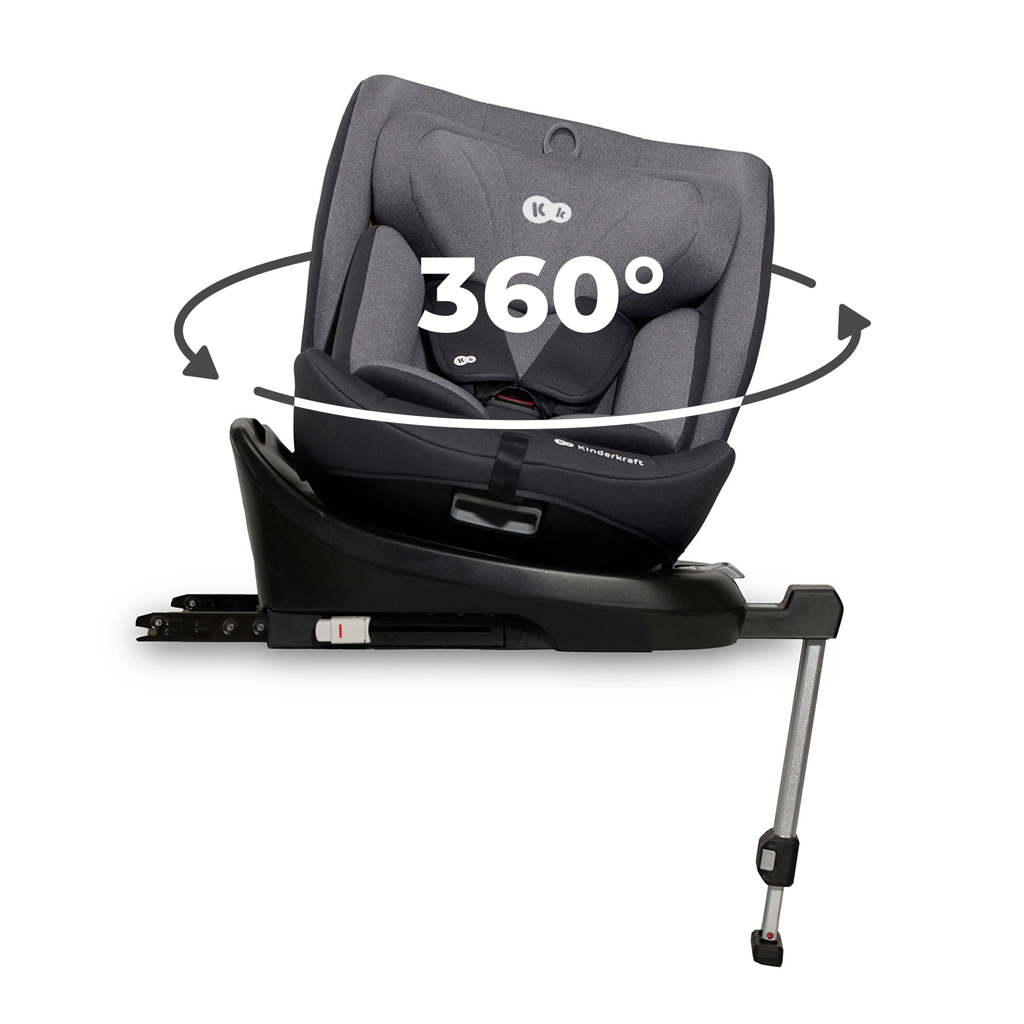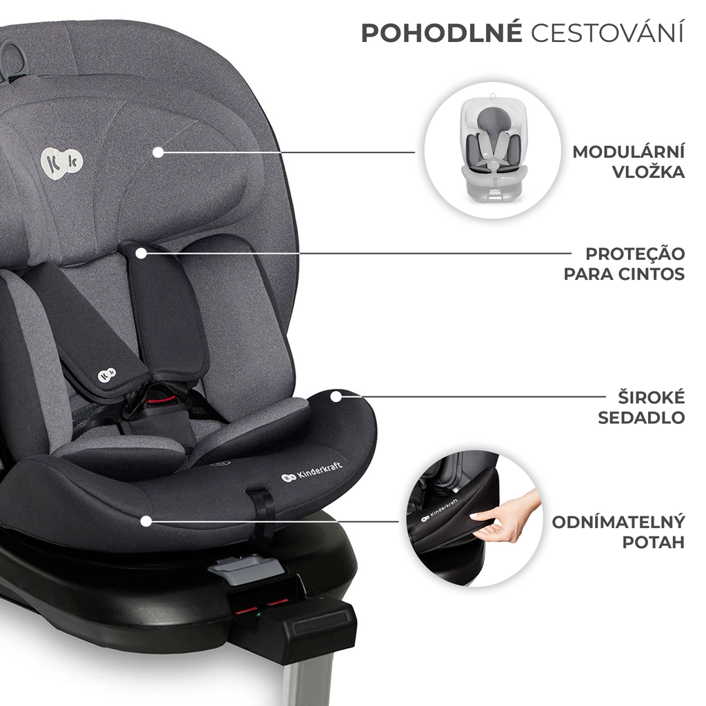 Otočná autosedačka KINDERKRAFT I-360 i-Size pre výšku dieťaťa 40–150 cm poskytuje maximálnu bezpečnosť a pohodlie od narodenia až približne do 12 rokov. Ponúka RWF až do 4 rokov, 360° otočný systém pre jednoduché usadenie, ISOFIX s ukazovateľmi správnej inštalácie a stabilizačnú nohu. Ochranu zvyšujú H-GUARD a SIDE PROTECT SYSTEM+, zatiaľ čo 12-polohová opierka hlavy, 5 polôh sklonu a mäkké vložky s pamäťovou penou zaisťujú komfort na každej ceste.