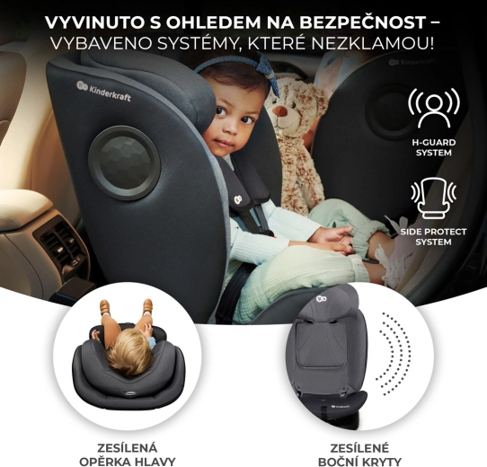 O bezpečnosť sa stará H-GUARD – trojvrstvová opierka hlavy s pamäťovou penou, a SPS+ – zosilnená bočná ochrana proti nárazom. Pre pohodlie nechýba 12 stupňov nastavenia opierky hlavy, 5 pozícií sklonu (RWF aj FWF) a vložka z pamäťovej peny pre menšie deti. Poťah možno ľahko sňať a vyprať.