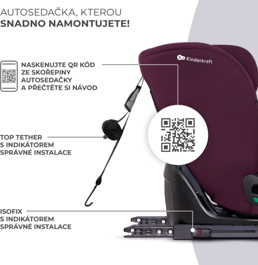 ISOFIX konektory a horný popruh TOP TETHER s indikátormi správneho upevnenia zaručia rýchlu montáž a stabilitu sedačky v aute.