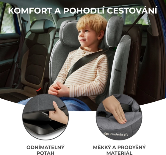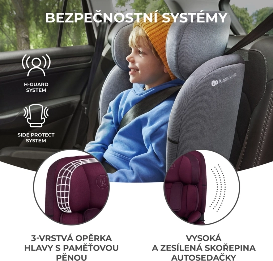 Bezpečie posilňujú vysoké bočné chrániče SIDE PROTECT SYSTEM a 3-vrstvová opierka hlavy H-GUARD s pamäťovou penou, ktoré účinne pohlcujú energiu nárazu. Pre komfort na každej trase nechýba RECLINING s 5 polohami náklonu, široké sedadlo, mäkké polstrovanie a vyberateľná vložka pre menšie deti. Poťah možno prať v práčke, na bokoch sú praktické háčiky na uchytenie popruhov pri usádzaní dieťaťa.