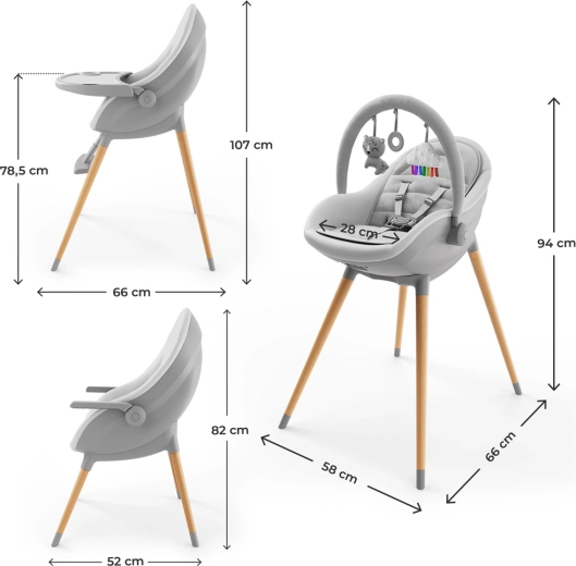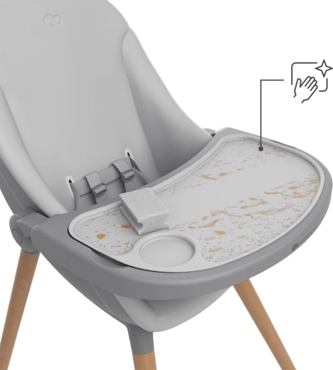 Praktickosť ide ruka v ruke s estetikou: bukové nohy, tlmené farby a mäkké materiály zapadnú do interiéru, zatiaľ čo dvojitý pultík umožní bleskové upratovanie po jedle. 5-bodové pásy, protišmykové zakončenie nôh a nízke ťažisko zaisťujú bezpečie aj v akčnejších chvíľach. O zábavu sa postará hrazdička s tromi hračkami a o pohodlie najmenších mäkká novorodenecká vložka.