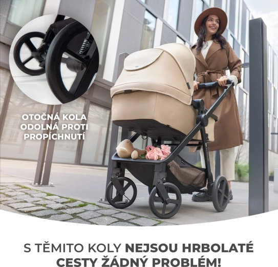 Súčasťou sady je autosedačka MINK PRO i-Size (40–75 cm) so základňou ISOFIX a univerzálnymi adaptérmi, vďaka ktorým autosedačku pripnete priamo na rám a vytvoríte praktický travel system. Veľké kolesá sú odolné proti prepichnutiu, nevyžadujú dofukovanie a s odpružením zvládajú mestské chodníky aj parkové cesty. Rozmerná strieška s UPF50+ a vodoodolnou úpravou chráni pred slnkom, vetrom aj dažďom.