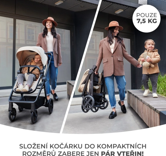 - Ľahký a kompaktný – len 7,5 kg, rýchle skladanie so sedadlom.