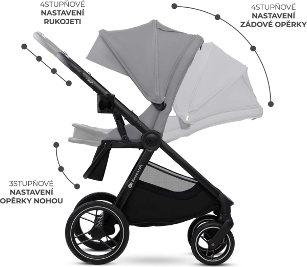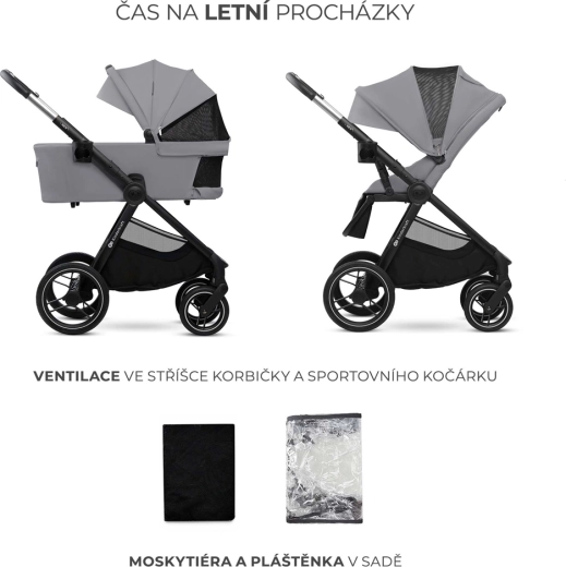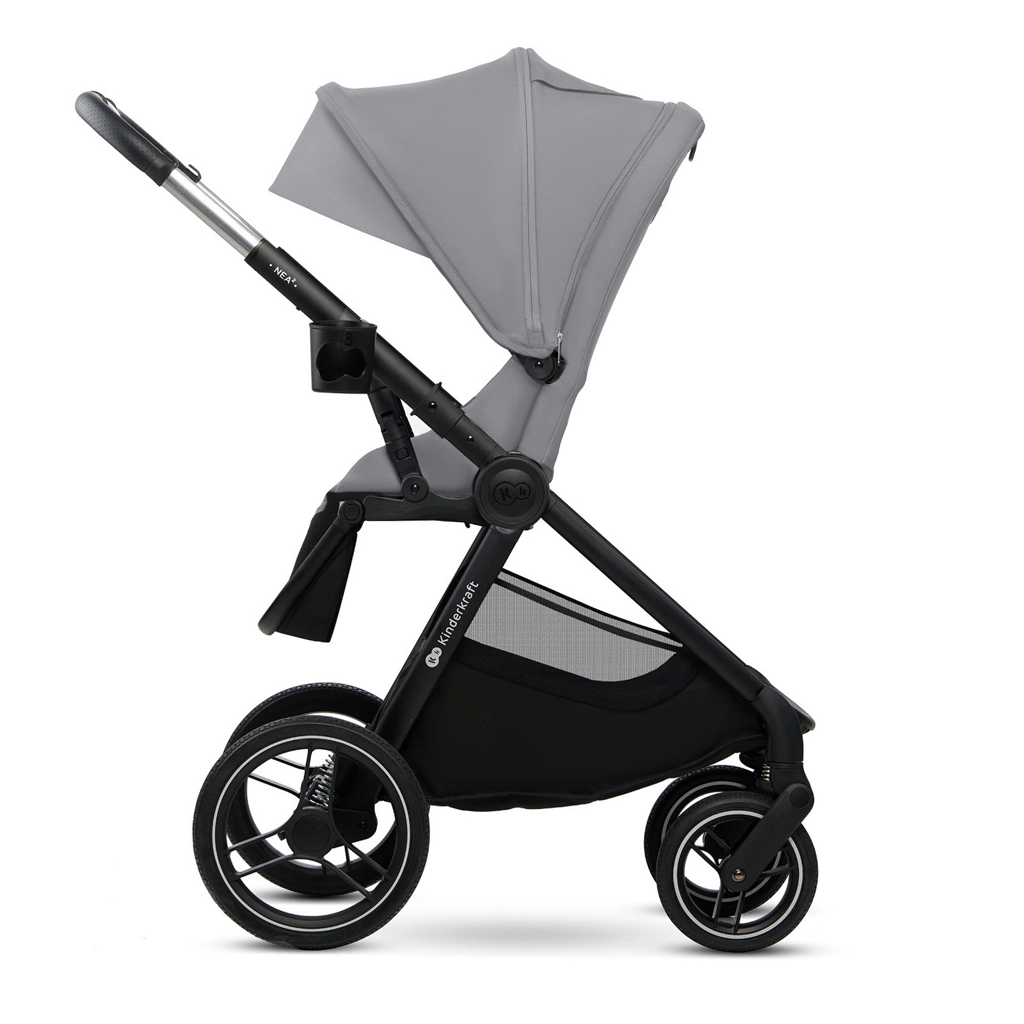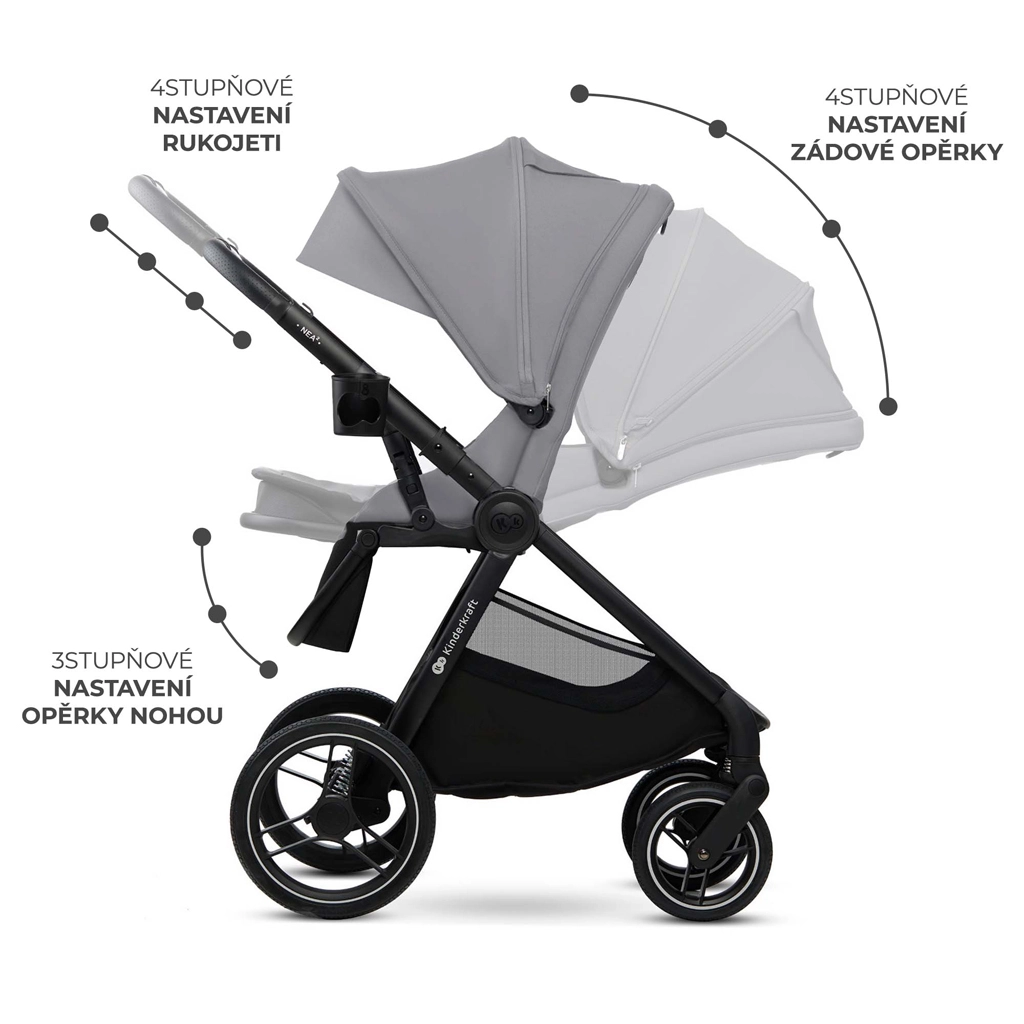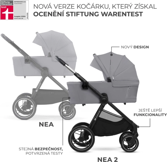KINDERKRAFT NEA 2 2v1 je premyslený kočík do mesta aj mimo neho. Veľké, odolné kolesá s odpružením zvládajú obrubníky aj nerovné cesty, zatiaľ čo ľahká konštrukcia a teleskopická rukoväť zaisťujú pohodlné manévrovanie. Vanička s mäkkým matracom je ideálna od narodenia, športové sedadlo potom rastie s dieťaťom až do 22 kg. Strieška s ochranou UPF50+, nepremokavým materiálom, ventilačným panelom a okienkom chráni a spríjemňuje každú prechádzku.