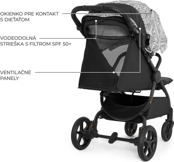 Veľká nepremokavá strieška s UPF50+ chráni pred vetrom, dažďom aj slnkom, vetrací panel a okienko pre kontakt s dieťaťom zaisťujú optimálnu cirkuláciu vzduchu a prehľad. Úplné odpruženie a veľké, nepichnuteľné kolesá zvládnu dlažbu aj štrk, pričom predné kolesá s otočením o 360° a možnosťou aretácie zvyšujú stabilitu v náročnejšom teréne. Skladanie jednou rukou do kompaktnej veľkosti s ochranou poťahu proti zašpineniu uľahčí cestovanie aj skladovanie.