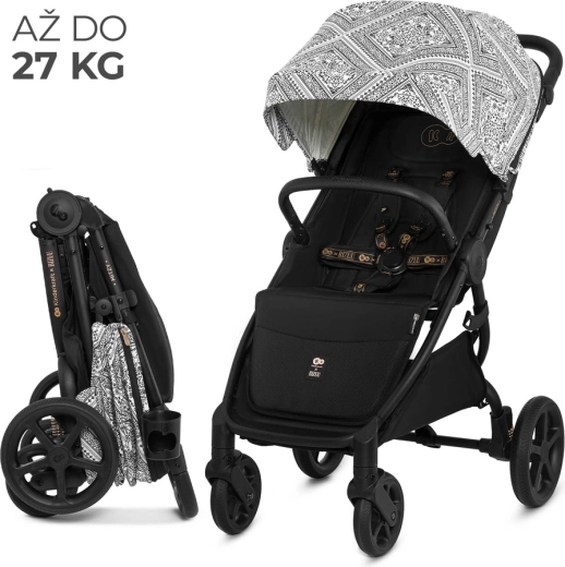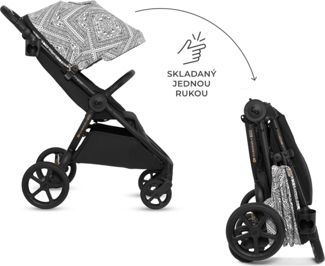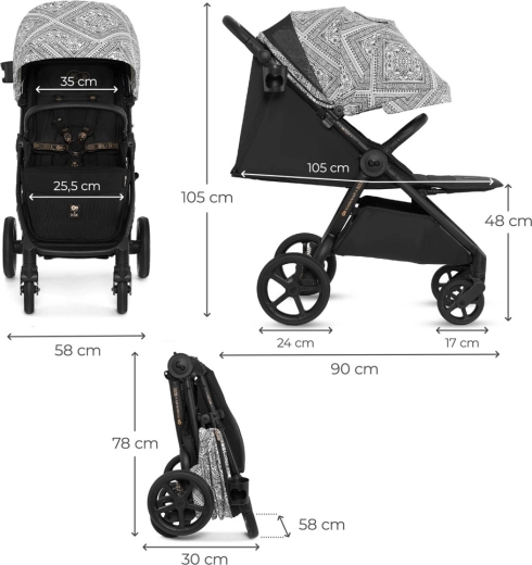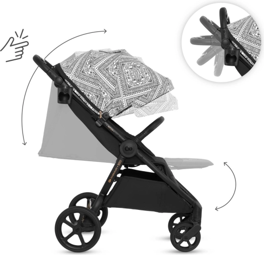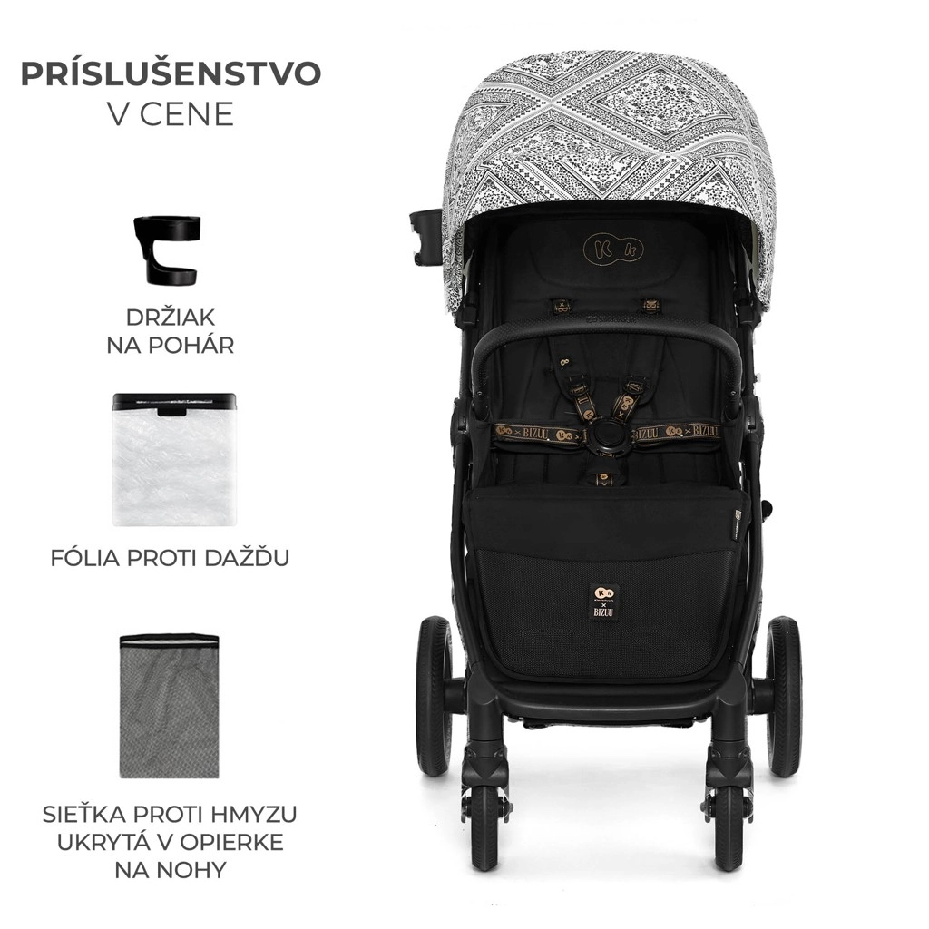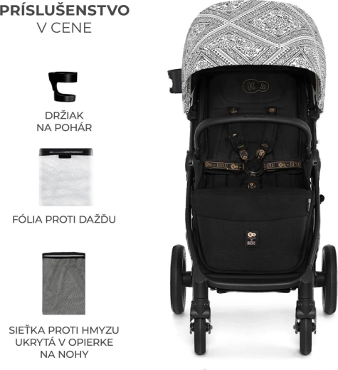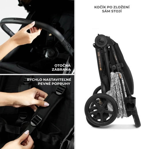 Súčasťou výbavy je integrovaná sieťka proti hmyzu ukrytá v opierke nôh, držiak na nápoj a pláštenka. Bezpečnosť zaisťujú polstrované 5-bodové pásy s rýchlym nastavením jednou rukou a otočné odklápacie madlo pre pohodlné usadenie dieťaťa. Priestranný kôš s nosnosťou 5 kg pojme hračky aj nákupy. Rám je kompatibilný s autosedačkami 0–13 kg pomocou univerzálnych adaptérov (predávajú sa samostatne).