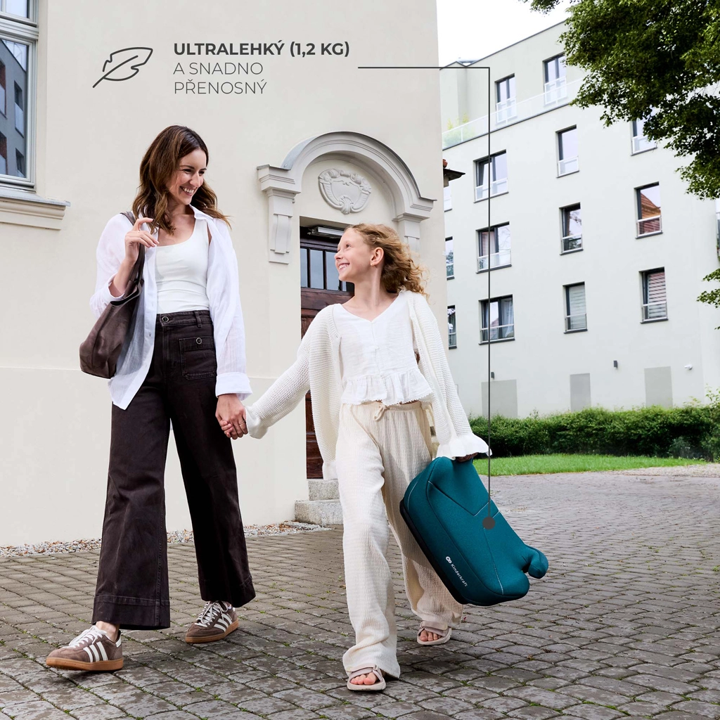 Sedadlo je ultraľahké (1,2 kg), takže ho ľahko prenesiete medzi vozidlami. Inštalácia je intuitívna pomocou 3-bodového bezpečnostného pásu, zatiaľ čo široké a mäkké sedadlo z kvalitnej peny sa postará o komfort aj pri dlhších jazdách. Ergonomické rukoväte pomáhajú viesť pás v správnej výške a odnímateľný poťah možno prať v práčke.