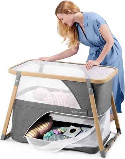 Multifunkčná postieľka 4v1 KIDERKRAFT Sofi v elegantnej sivej farbe kombinuje postieľku, cestovnú postieľku, ohrádku a hojdačku. Ponúka rýchle zloženie do 5 sekúnd, ľahký hliníkový rám v dekore dreva, priedušné sieťované boky a kvalitný penový matrac pre bezpečný a pohodlný spánok aj hranie doma aj na cestách.