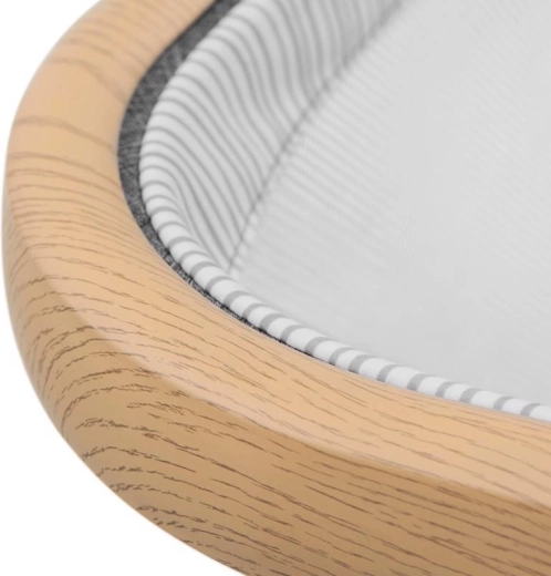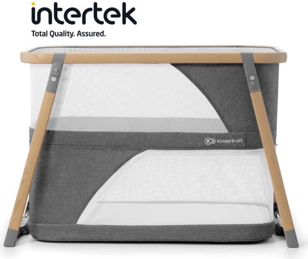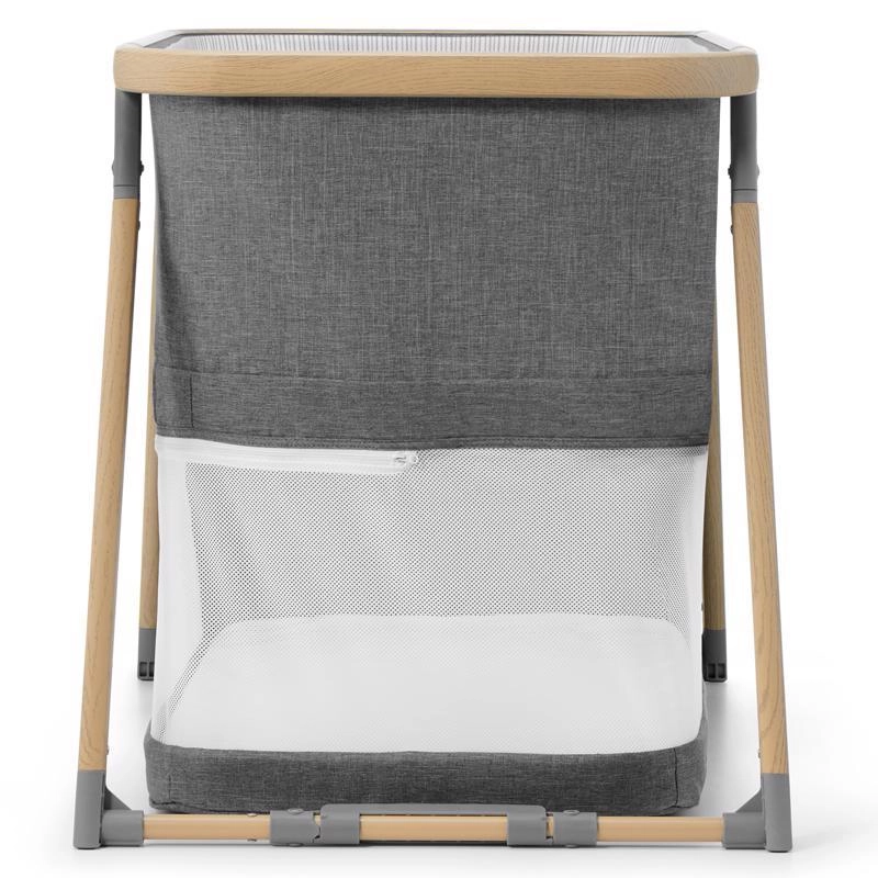Sieťované panely podporujú prúdenie vzduchu a umožňujú vizuálny kontakt s dieťaťom, zatiaľ čo hliníkový rám v dekore dreva zaručuje stabilitu.