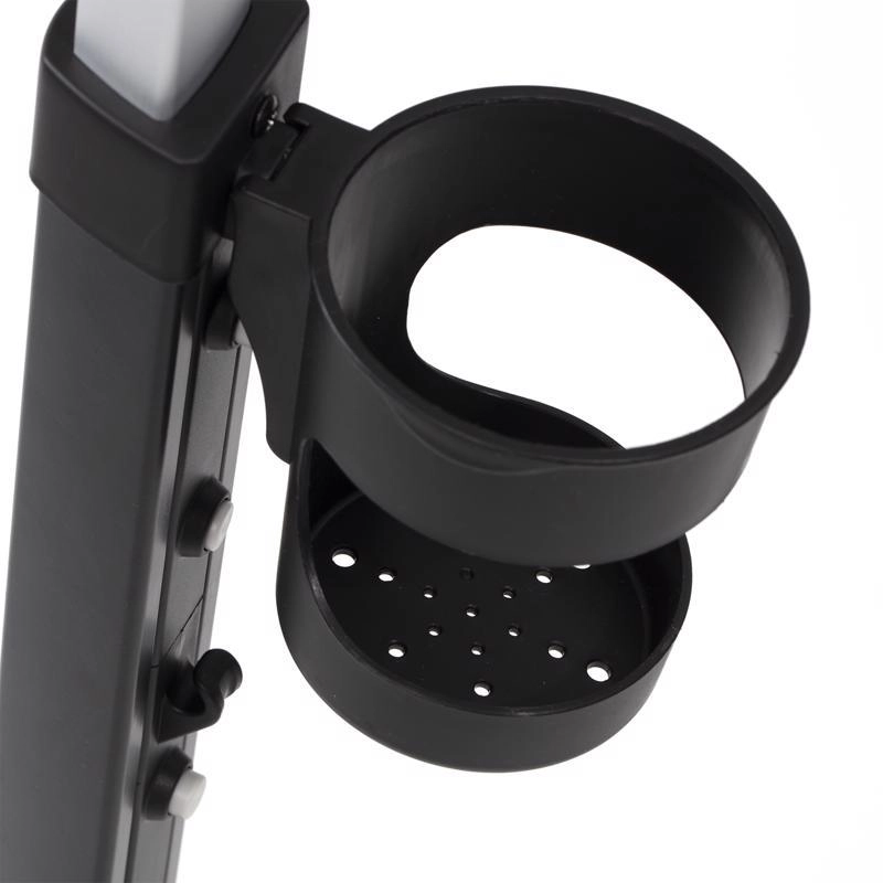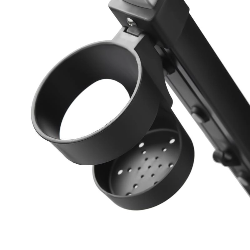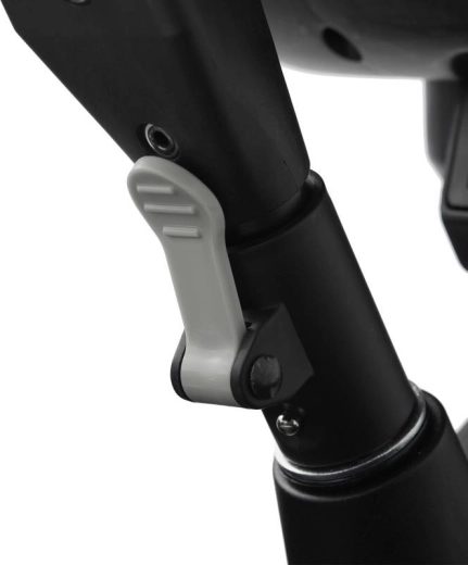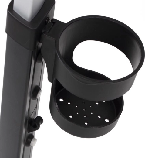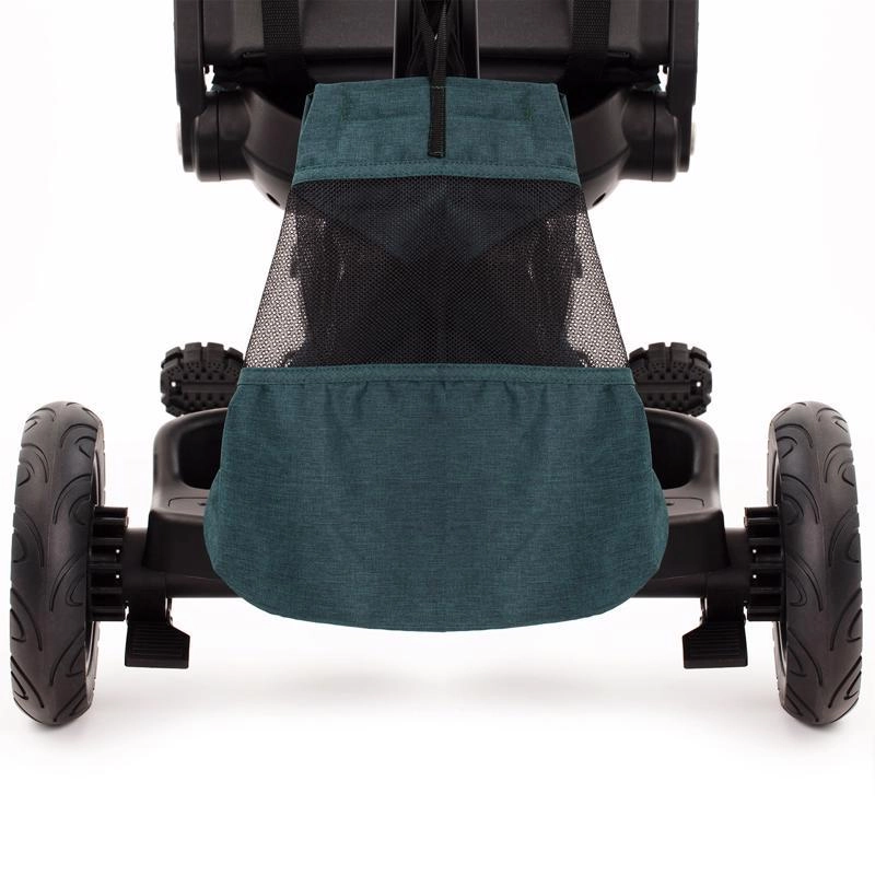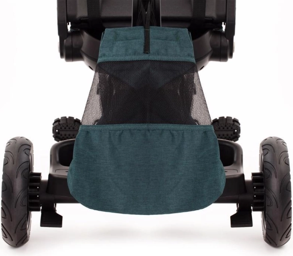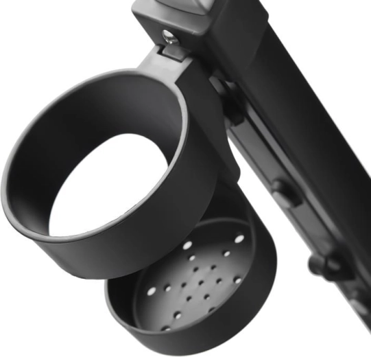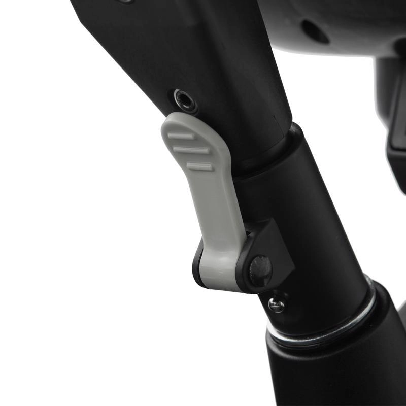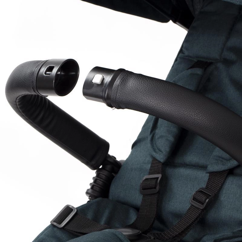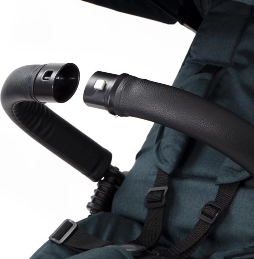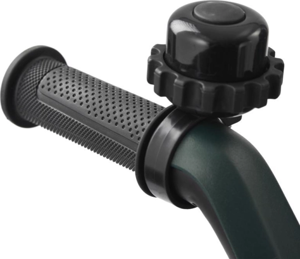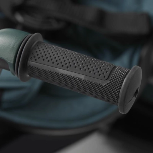Teleskopická rukoväť s tlačidlami na rýchle nastavenie, parkovacia brzda a bohaté príslušenstvo: držiak nápojov, zvonček, taška/batoh a košík.