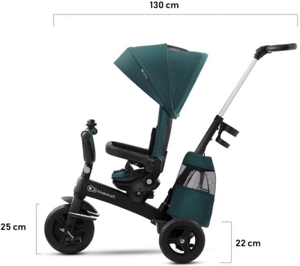 Jednoduchá údržba a šikovné doplnky potešia pri každodennom používaní: odnímateľný poťah na ľahké čistenie, príjemná barierka z eko kože, skladacie opierky nôh a praktická výbava – držiak nápojov, zvonček, batoh/taška a košík. Trojkolka spĺňa normu EN 71 a je pripravená na bezpečné objavovanie sveta.