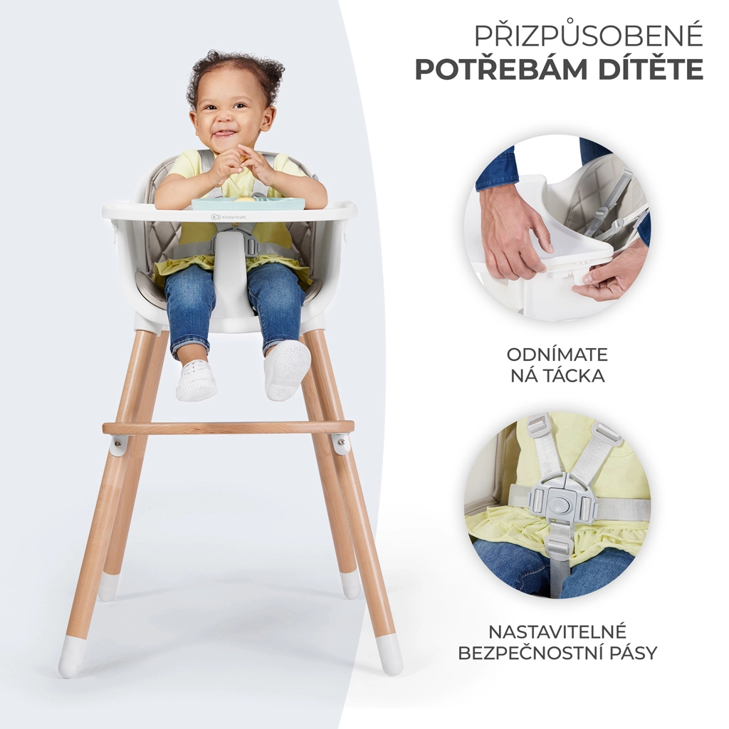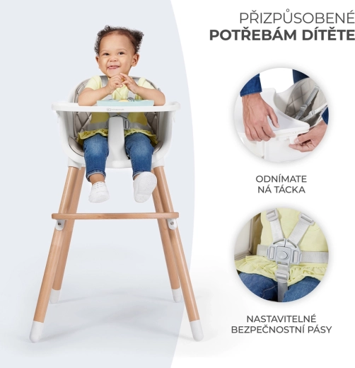 Praktická a štýlová jedálenská stolička 2v1, ktorá rastie s vaším dieťaťom – vysoká stolička na kŕmenie aj nižšia stolička pre staršie deti (do 20 kg). Ľahko sa čistí vďaka odnímateľnému podnosu a plastovému sedáku, ponúka pohodlnú opierku nôh a bezpečie zaisťujú 5-bodové pásy a protišmykové koncovky na nožičkách.