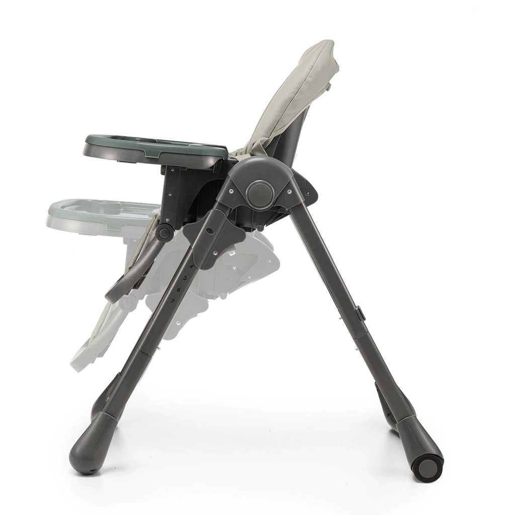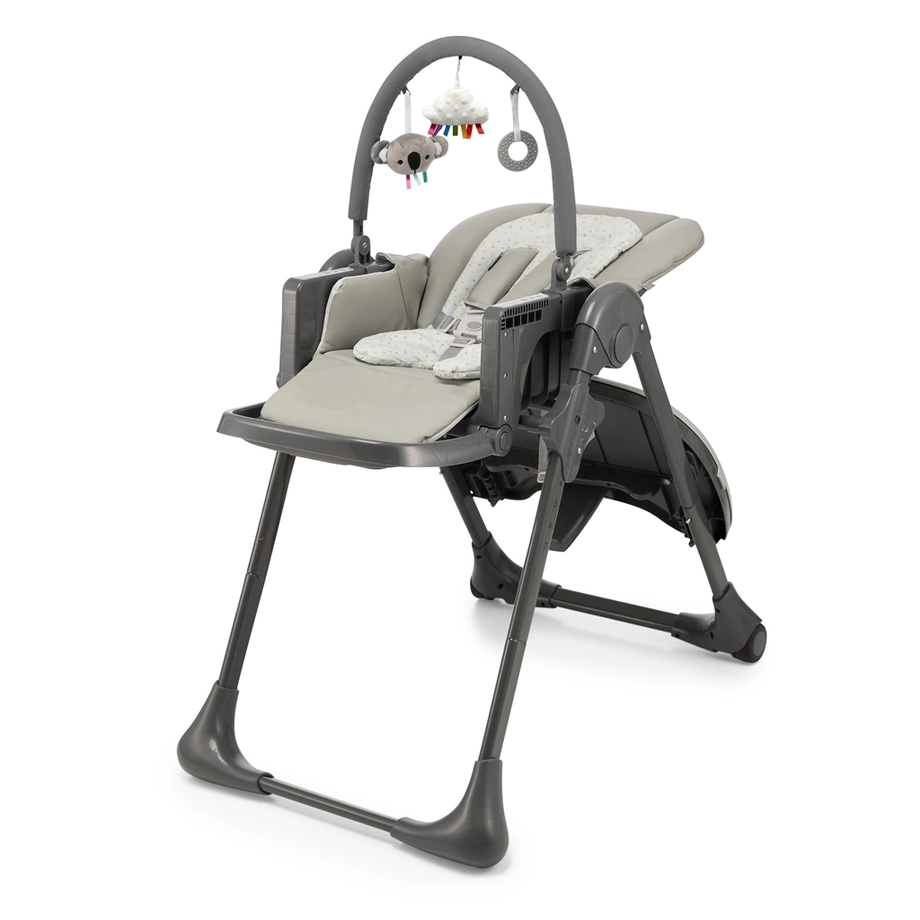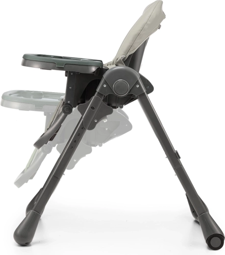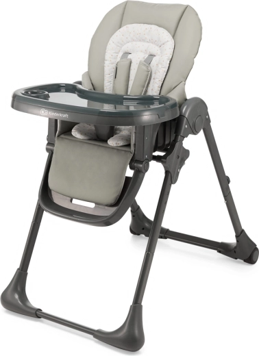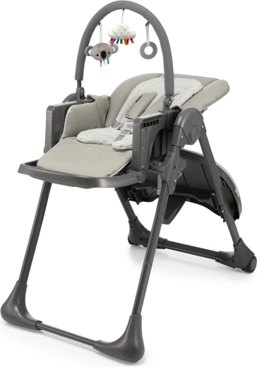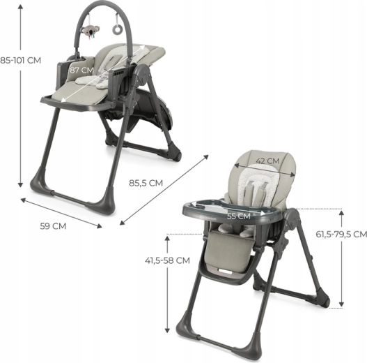 Stoličku prispôsobíte každému stolu vďaka 7 stupňom výšky, operadlo chrbta má 4 polohy vrátane relaxačnej, opierka nôh 3 polohy. Po jedle ju počas chvíľky zložíte takmer naplocho, táck zavesíte na zadné nohy a vďaka kolieskam ju ľahko presuniete. Nadčasový sivý dizajn sa hodí do moderných interiérov a materiály sa jednoducho čistia vlhkou handričkou.