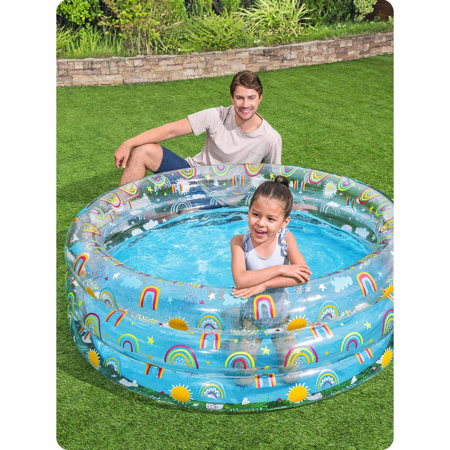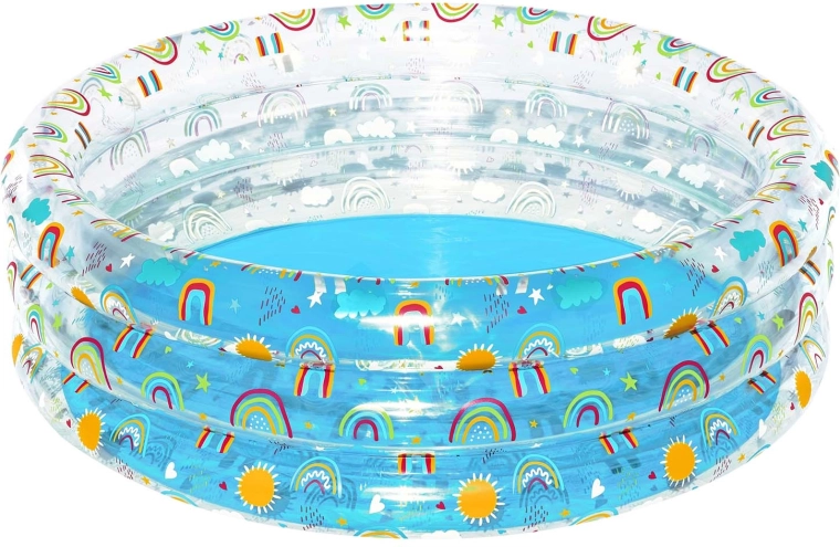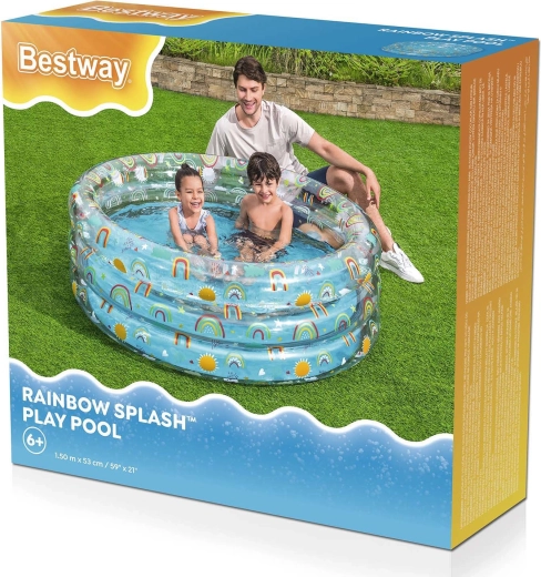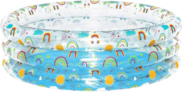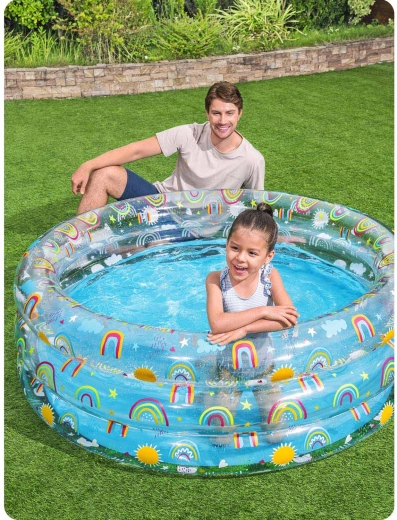 Nafukovací bazén Bestway s hravými motívmi dúhy je skvelou voľbou na vonkajšie vodné radovánky detí od 6 rokov. Pevný PVC materiál a tri samostatné nafukovacie prstence zaisťujú stabilitu aj pohodlie pri šantení. S hĺbkou, ktorá je pre deti príjemná, ponúkne bezpečné a zábavné osvieženie na záhrade.