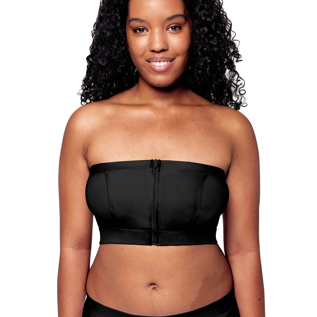 Strih bez ramienok so štruktúrovanými panelmi a elastickým spodným lemom zabezpečuje stabilitu, komfort a úplné zakrytie bradaviek pod oblečením.