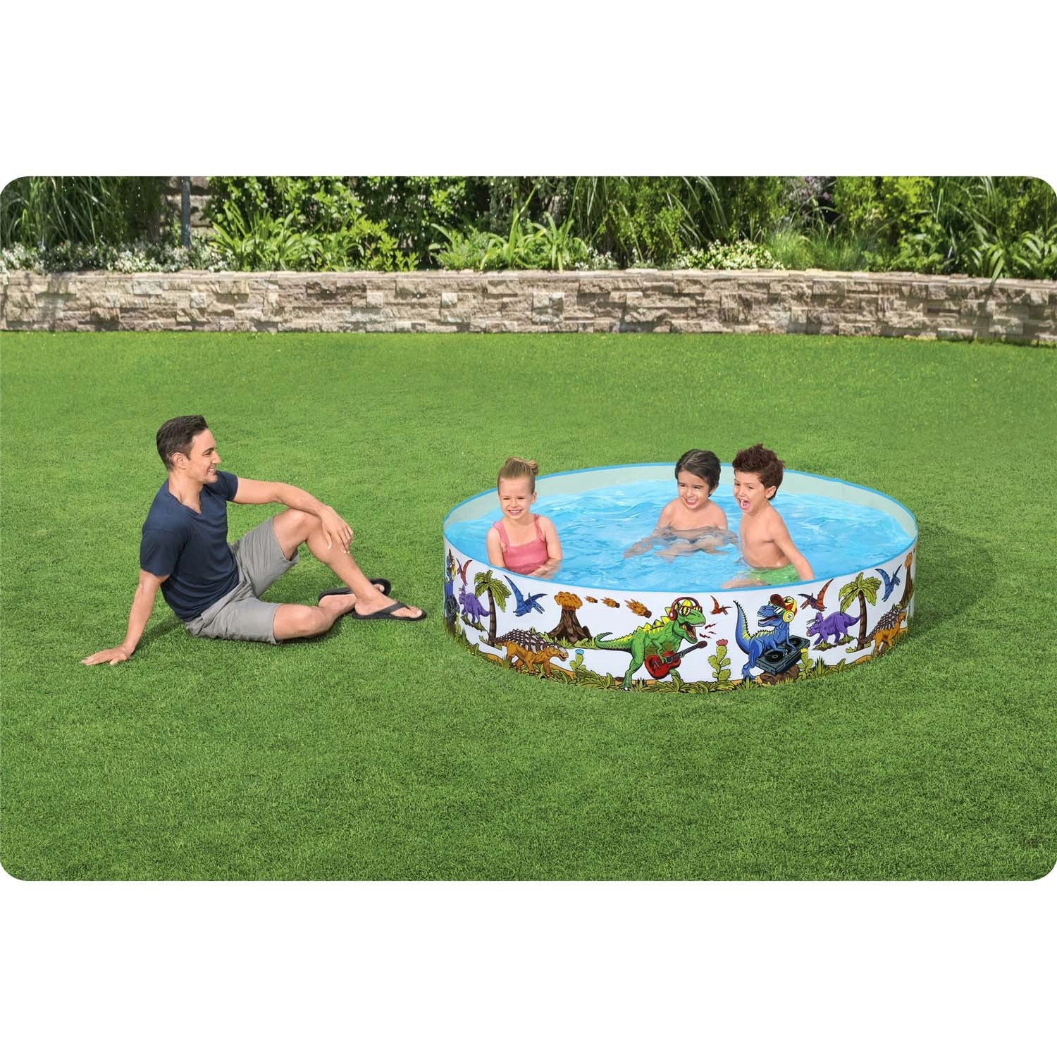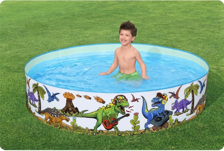 Farebná grafika s dinosaurami zmení každú záhradu na hravý praveký svet, ktorý deti baví a láka do vody.