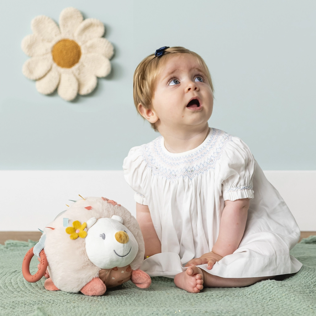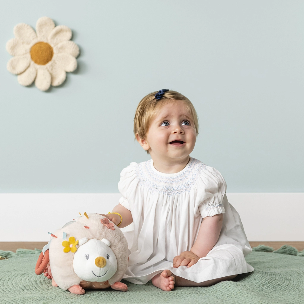 Plyšový ježko Zoe kombinuje hebké materiály s premyslenými zmyslovými prvkami, ktoré deti motivujú k objavovaniu. Vďaka rôznym textúram, zvukom a zrkadielku je hračka skvelá na bežné hranie, mojkanie aj upokojenie. Ľahký, zaoblený tvar sa ľahko drží aj drobnými ručičkami.
