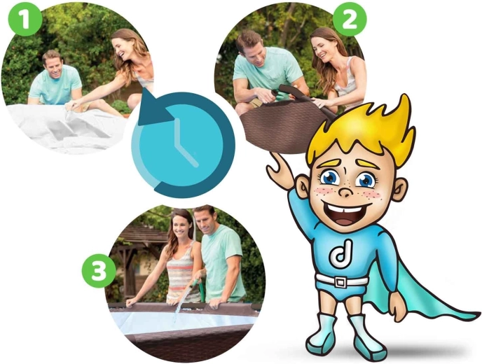 Inštalácia prebieha v troch krokoch: rozvinúť plachtu, zostaviť rám bez náradia, napustiť vodu. Pre ešte väčšiu radosť z kúpania sú súčasťou aj plavecké okuliare a farebná plážová lopta.
