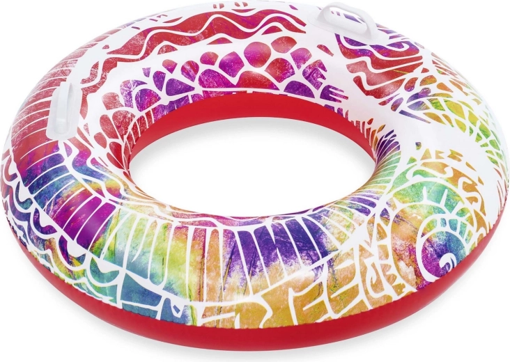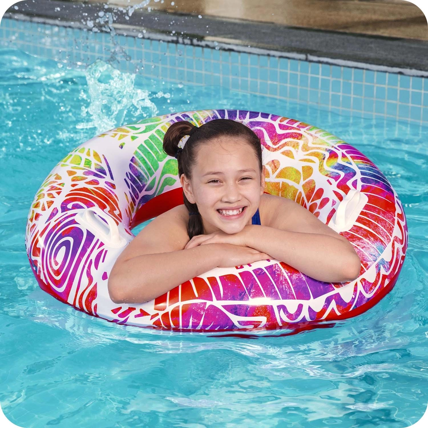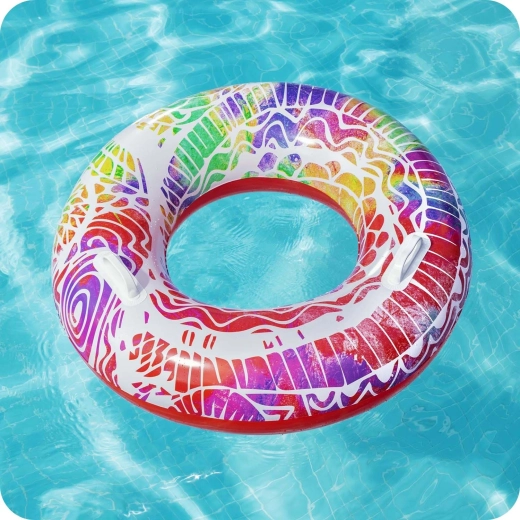 Vďaka väčšiemu priemeru 91 cm ponúka kruh vyšší vztlak a pohodlnú oporu pre deti od 10 rokov aj drobnejších dospievajúcich. Atraktívna duhová/mozaiková potlač dodá vašej letnej výbave štýl a je na vodnej hladine dobre viditeľná.