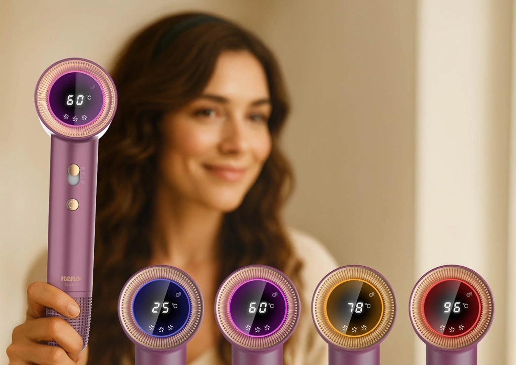 Neno Beauty Silvia kombinuje modernú technológiu a každodenný komfort. Vďaka pokročilej ionizácii eliminuje statickú elektrinu, uzatvára kutikuly a zanecháva vlasy hladké a lesklé. Inteligentný senzor stráži teplotu až 100× za sekundu, čím chráni vlasy pred prehriatím a poškodením. LED displej s farebným krúžkom prehľadne ukazuje teplotu aj rýchlosť prúdenia, takže máte styling pod kontrolou jediným pohľadom.
