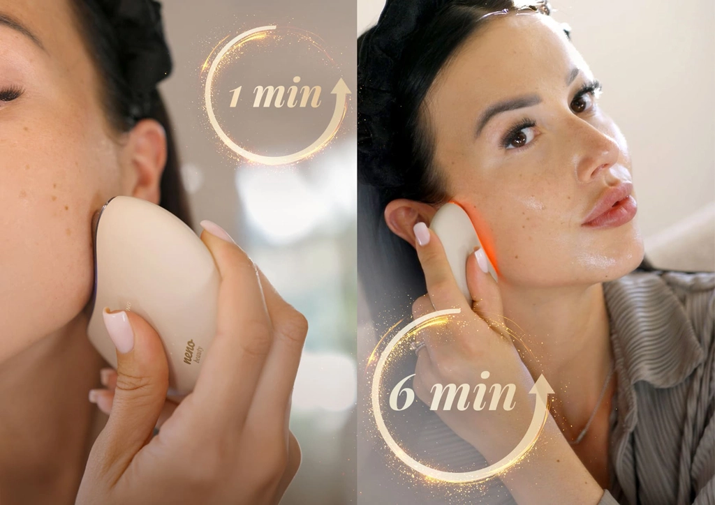 - 2 režimy starostlivosti: Anti‑Aging (RF + vibrácie) a Brighten (RF + EMS + červené LED + vibrácie)