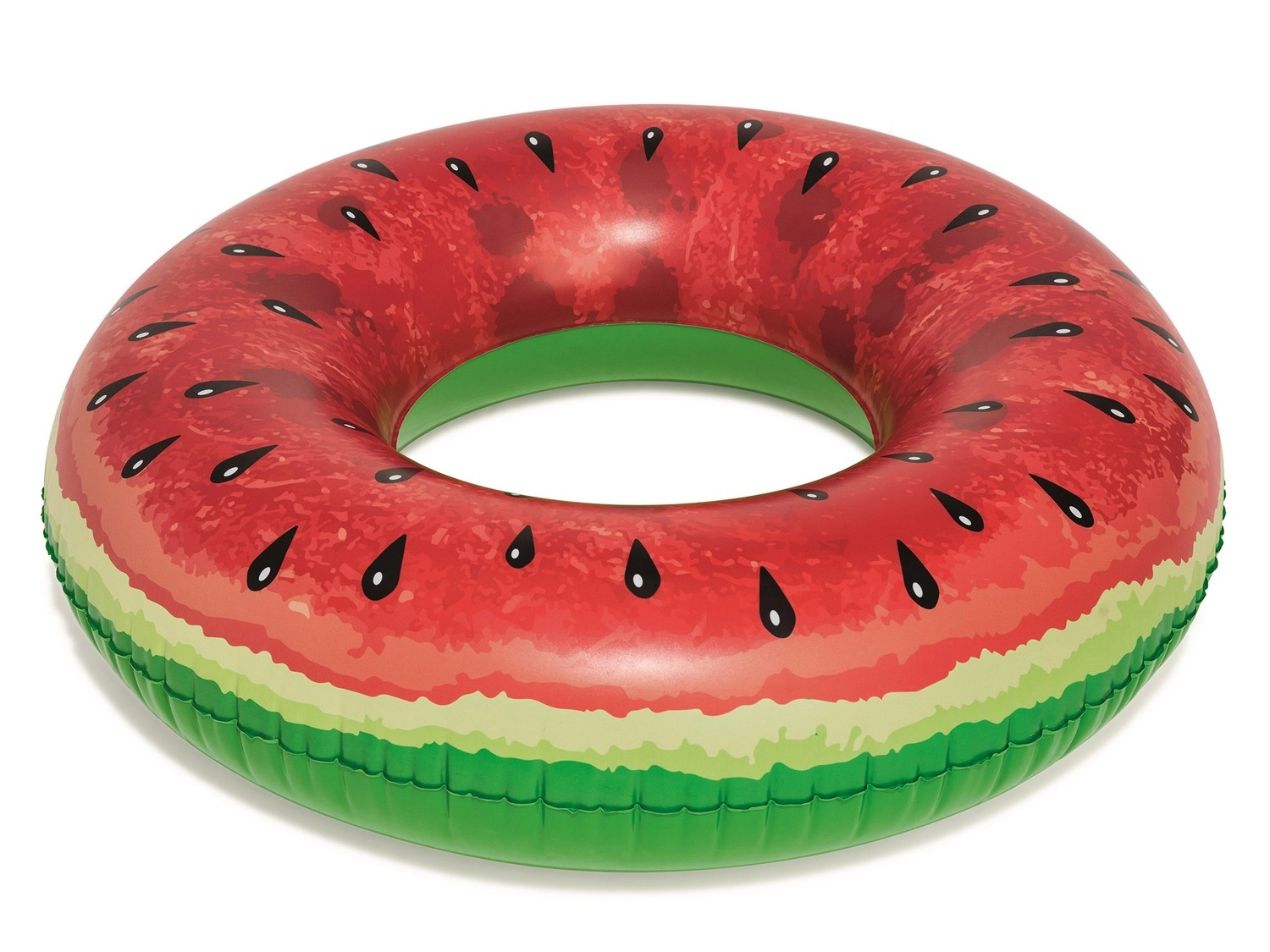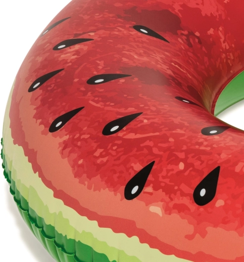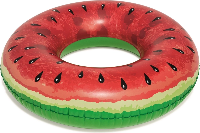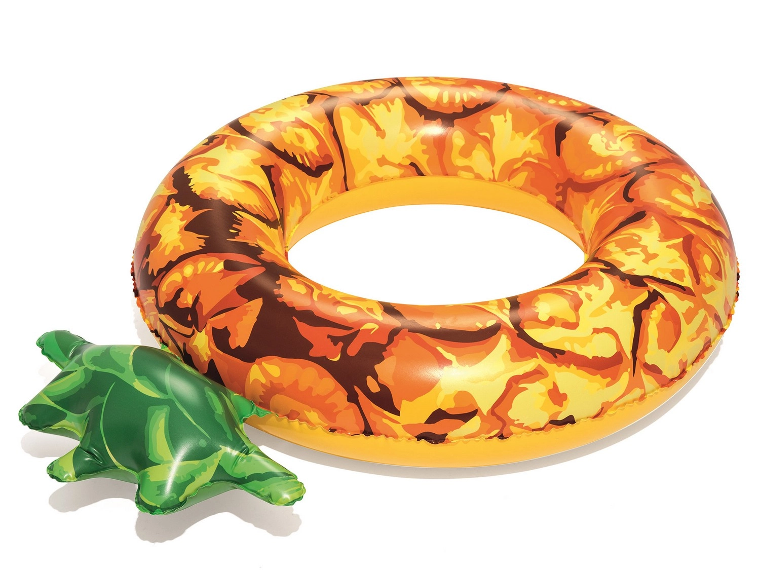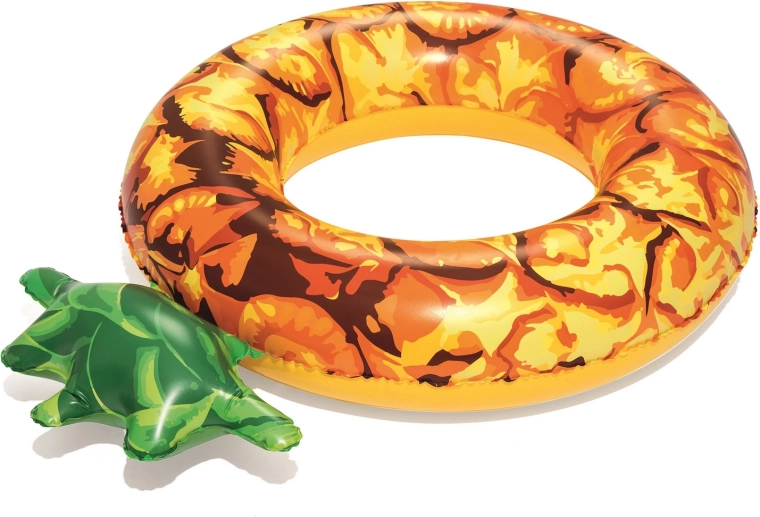 Nafukovací plávací kruh v štýle šťavnatého ananásu zaujme na prvý pohľad. Je vyrobený z kvalitného PVC, ktoré je odolné voči UV žiareniu a slanej vode, takže si bez starostí užijete zábavu pri mori aj v bazéne. Vďaka veľkým rozmerom 116 × 88 cm je kruh pohodlný pre dospievajúcich aj dospelých (od 12 rokov).