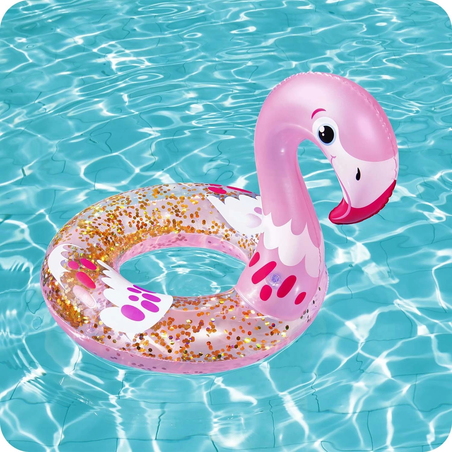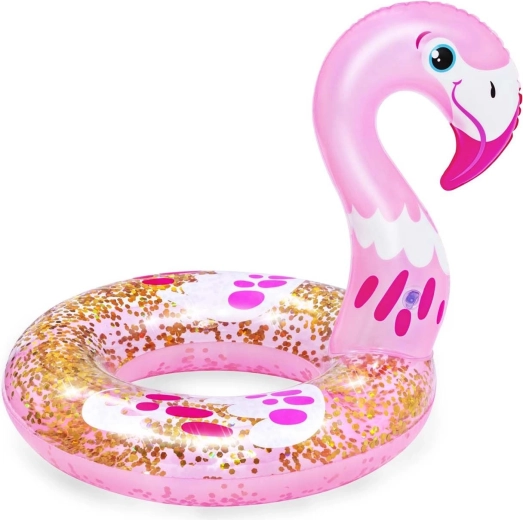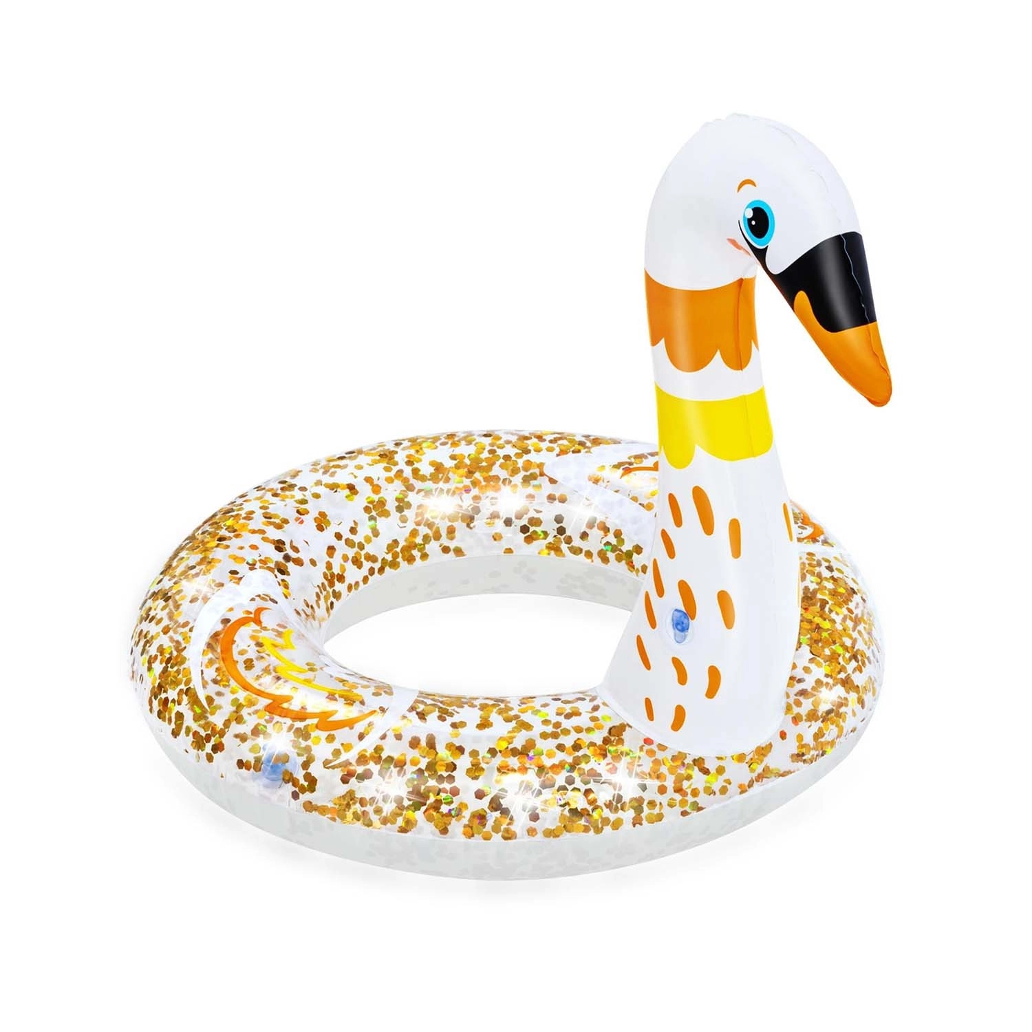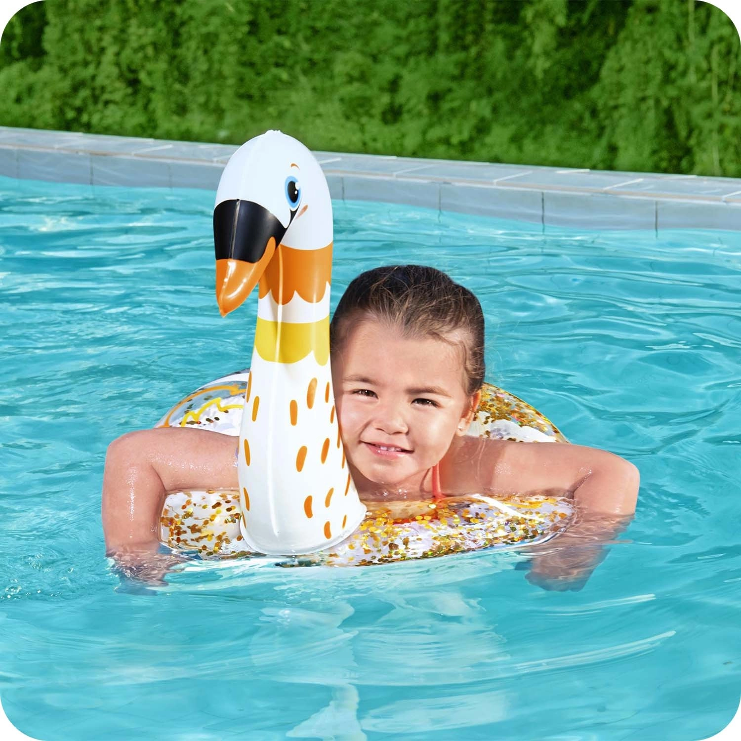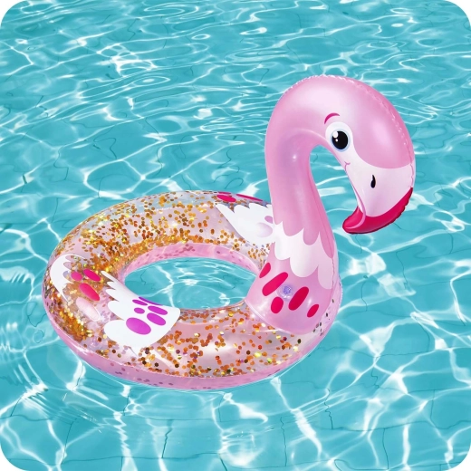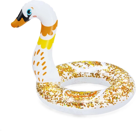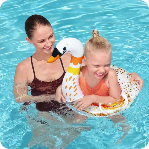 Nafukovací kruh BESTWAY premení každé kúpanie na zábavu. Realistický tvar labutě alebo plameniaka deti okamžite zaujme a povzbudí ich k pohybu vo vode. Priehľadné časti so zlatými trblietkami sa krásne lesknú na slnku a dodávajú kruhu jedinečný vzhľad.