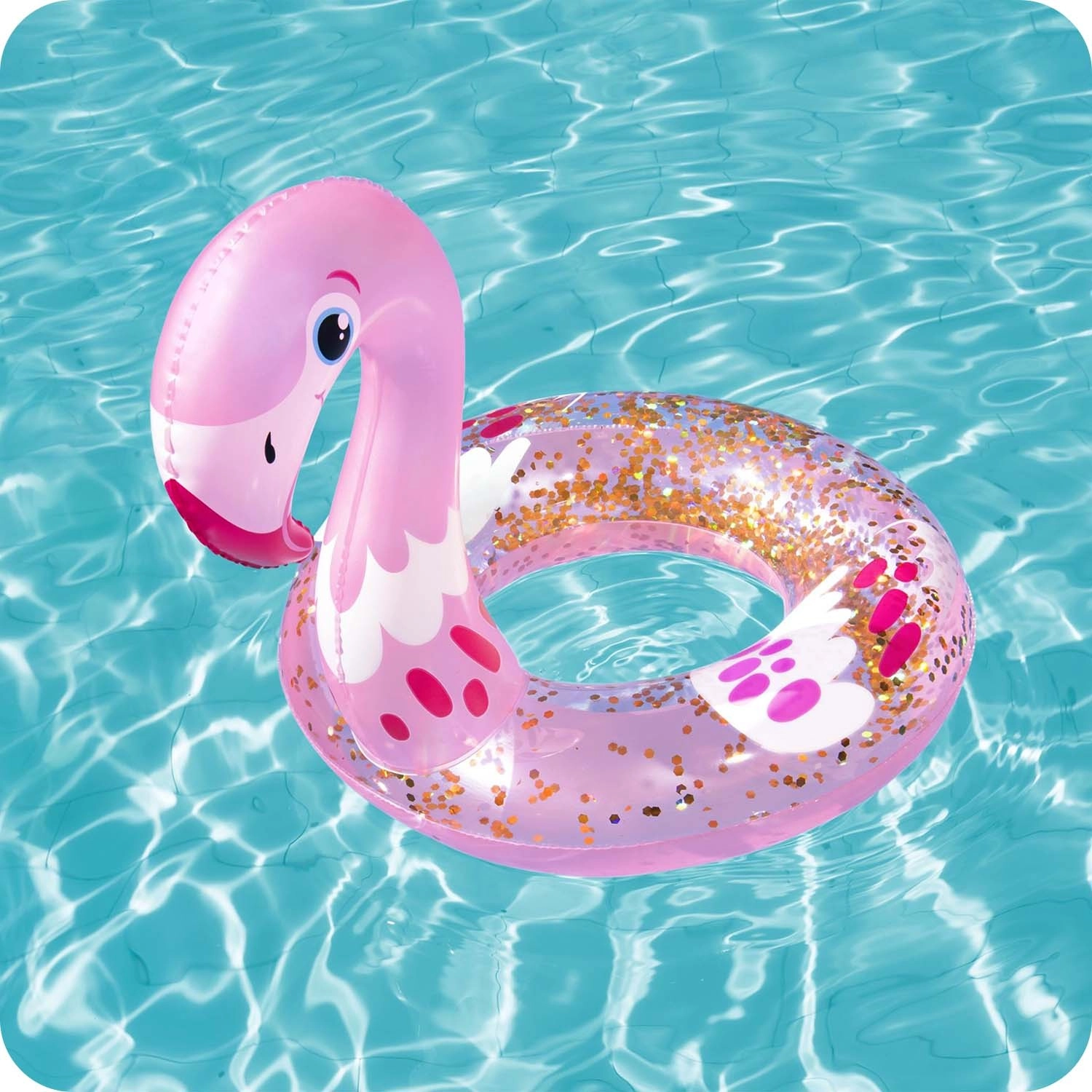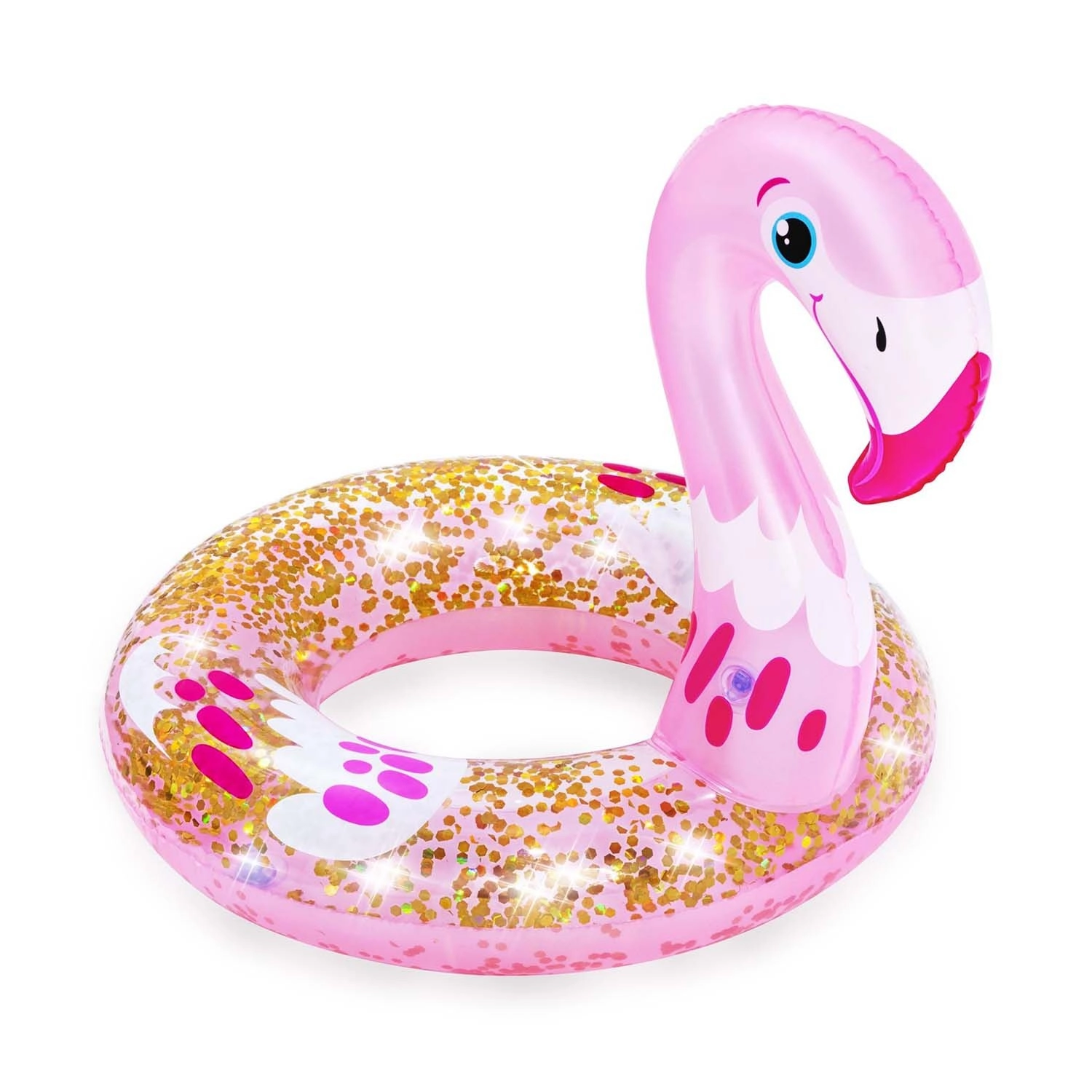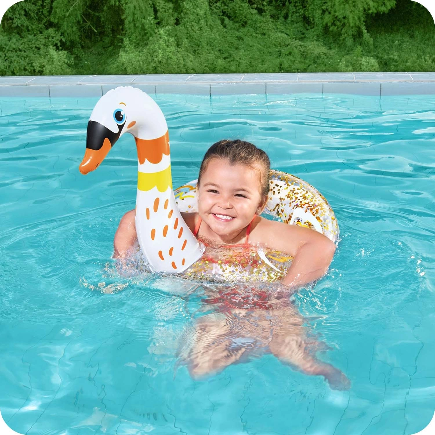 Nafukovací kruh BESTWAY premení každé kúpanie na zábavu. Realistický tvar labutě alebo plameniaka deti okamžite zaujme a povzbudí ich k pohybu vo vode. Priehľadné časti so zlatými trblietkami sa krásne lesknú na slnku a dodávajú kruhu jedinečný vzhľad.