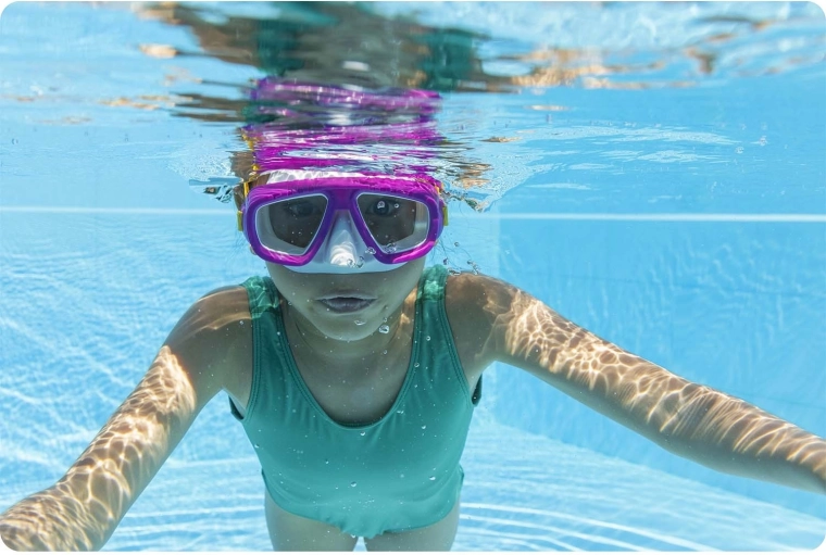 Číre polykarbonátové šošovky ponúkajú široké zorné pole a vysokú odolnosť proti poškriabaniu – ideálne do bazéna aj mora.